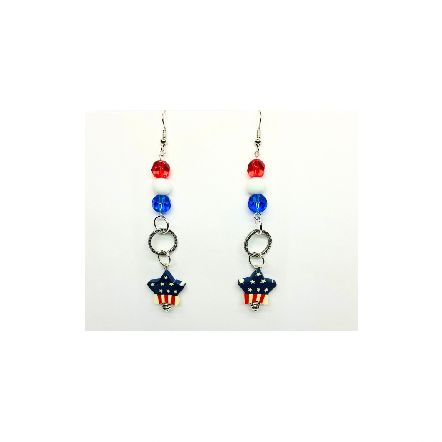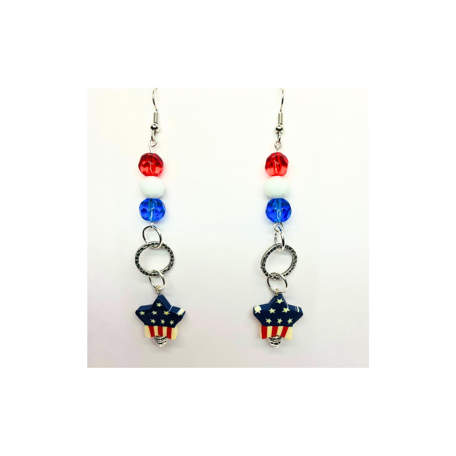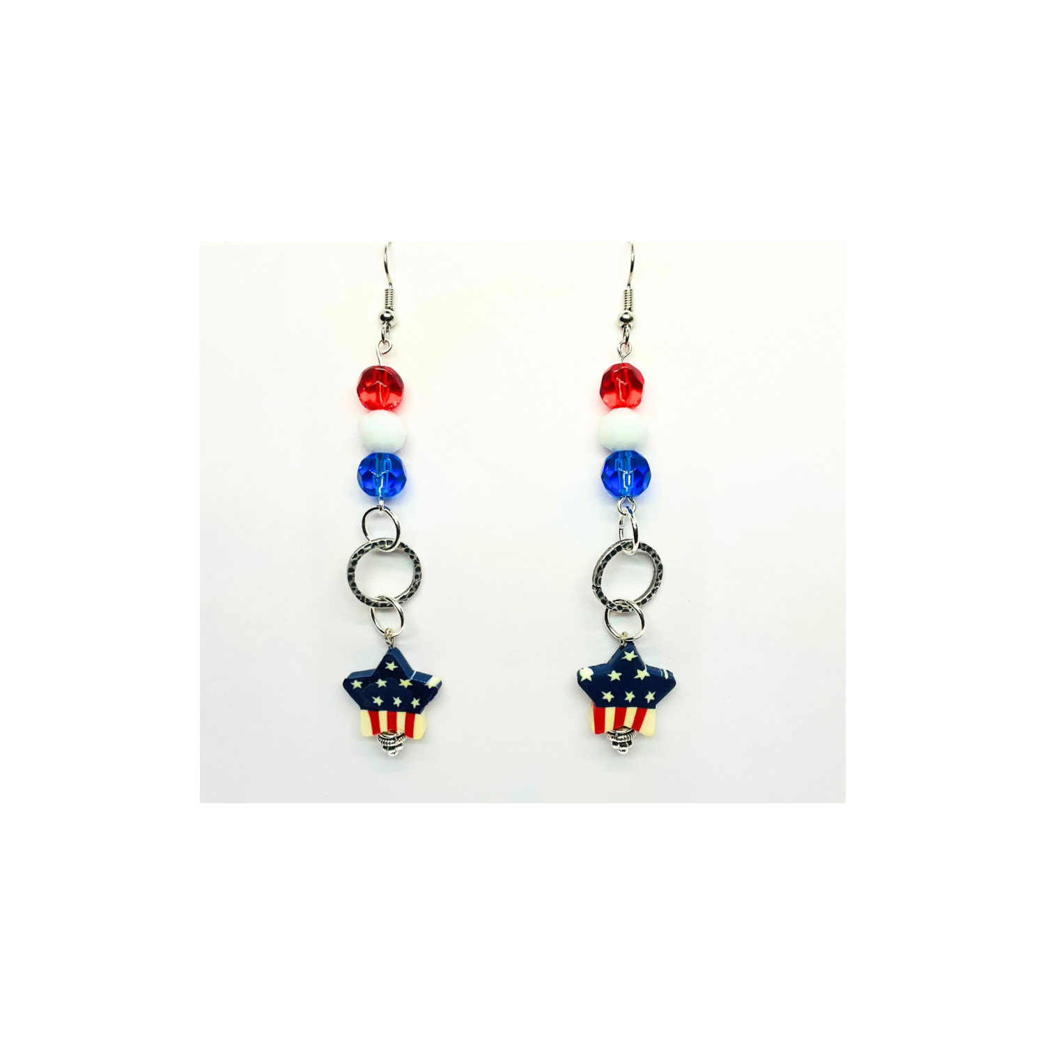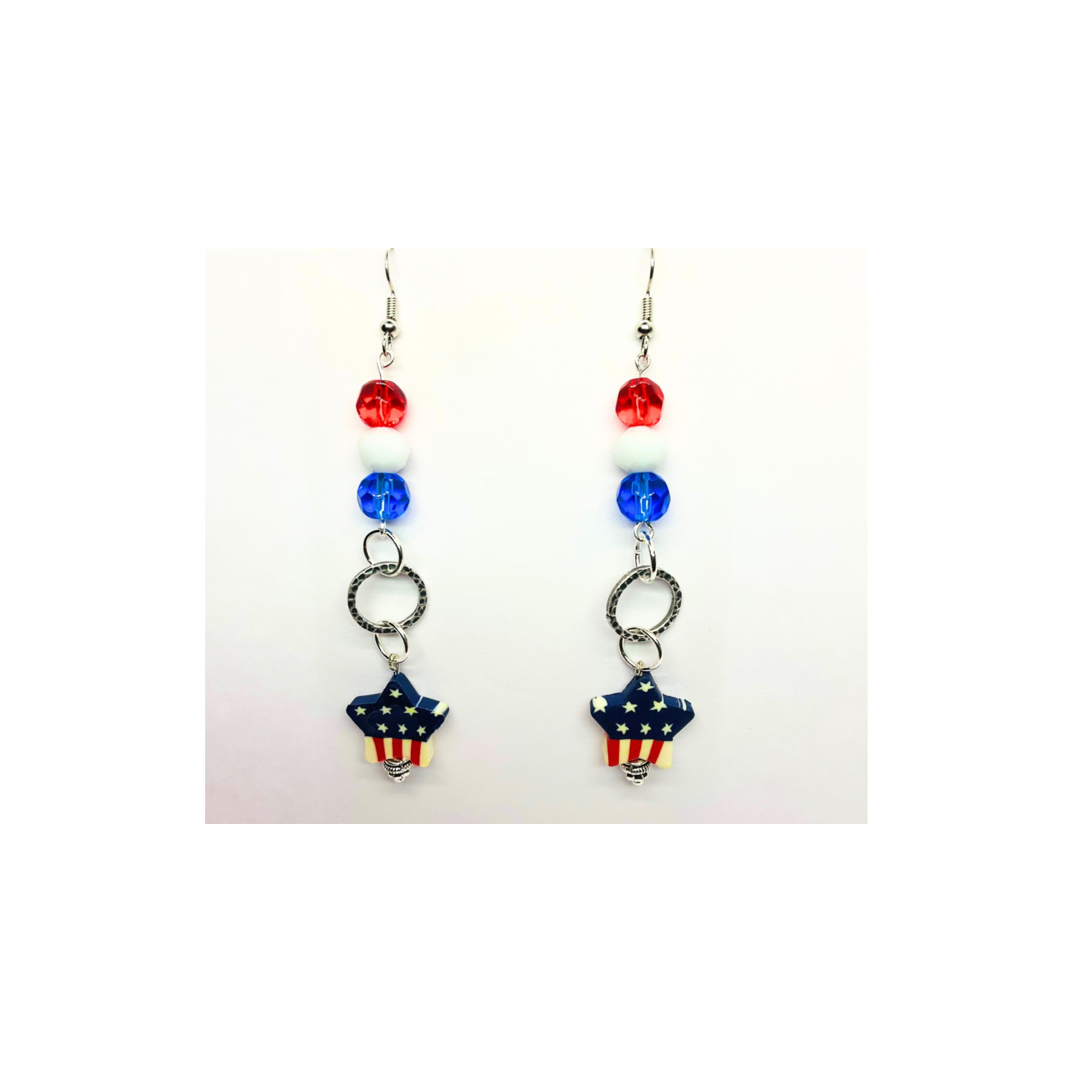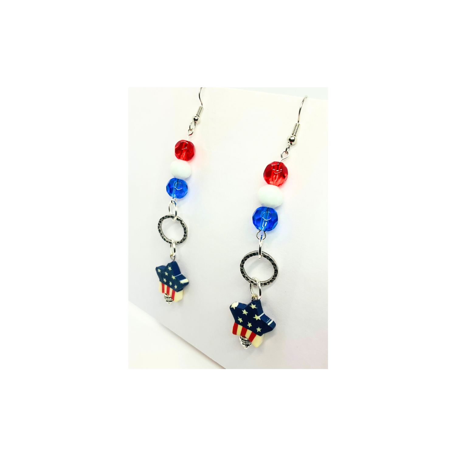 โจ Patriotic Collection USA Star with Bead Dangle Earring for female patriotic accessories. These earrings feature red, white, and blue beads, perfect for showing your pride. The design includes a star, adding a touch of national symbolism. Ideal for those who love to express their patriotism through fashion.