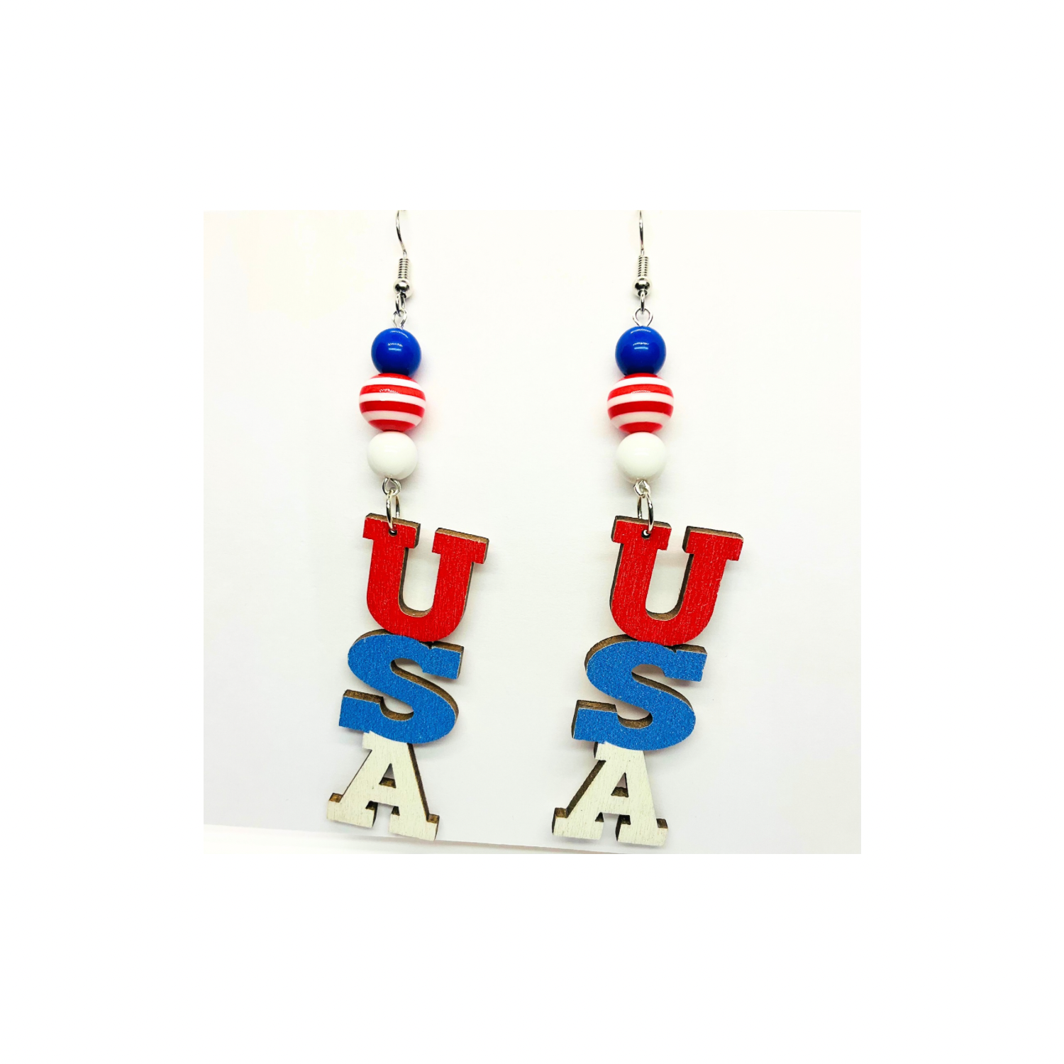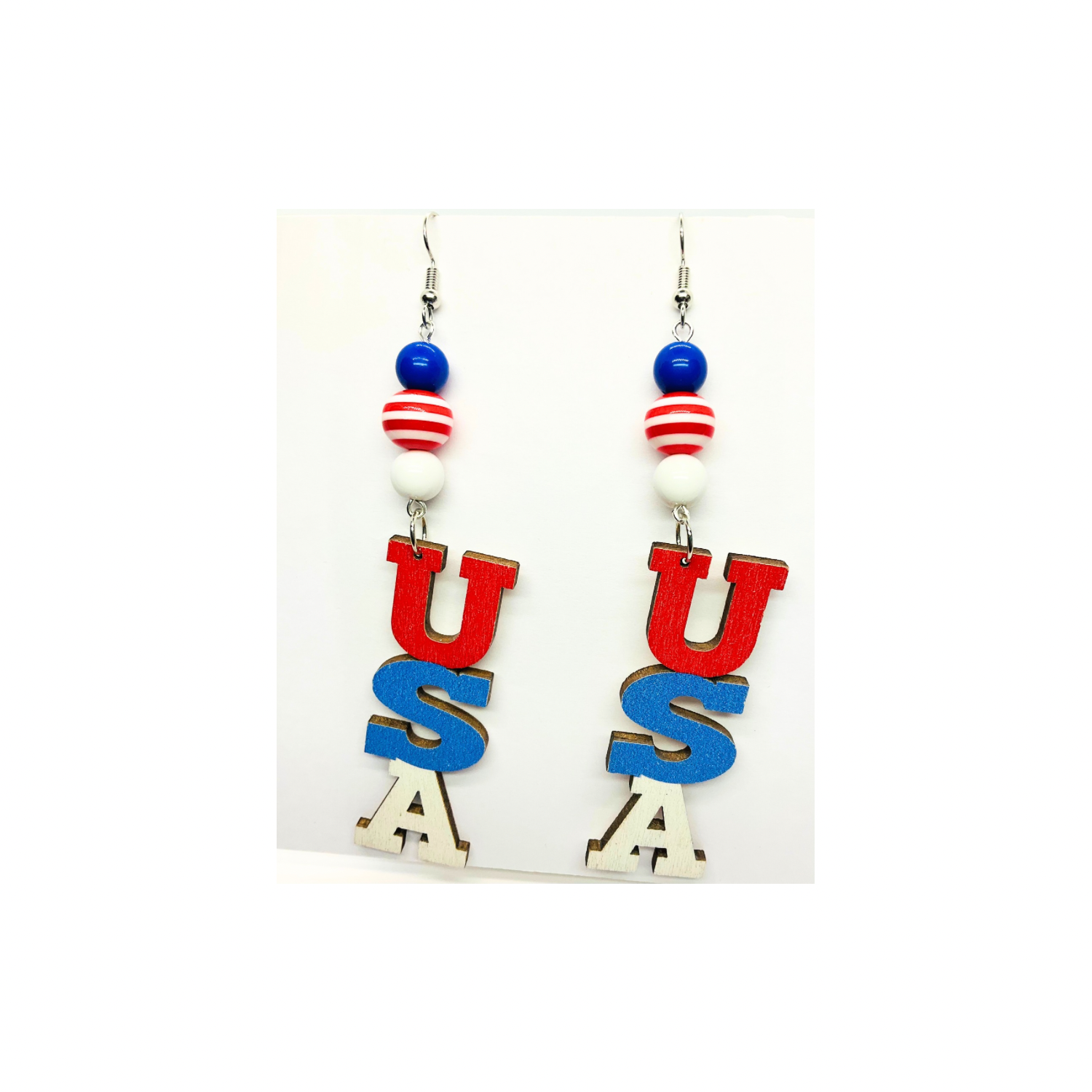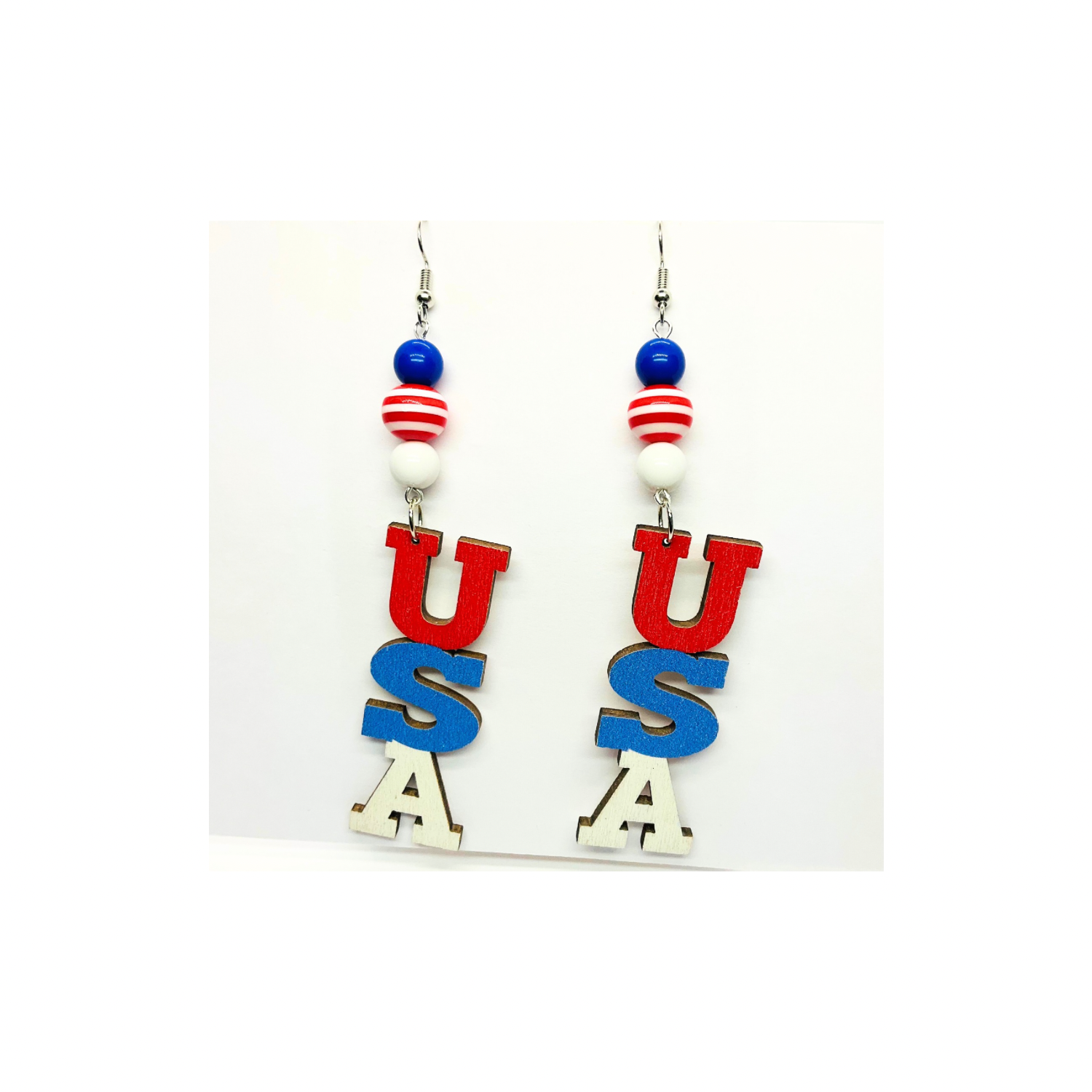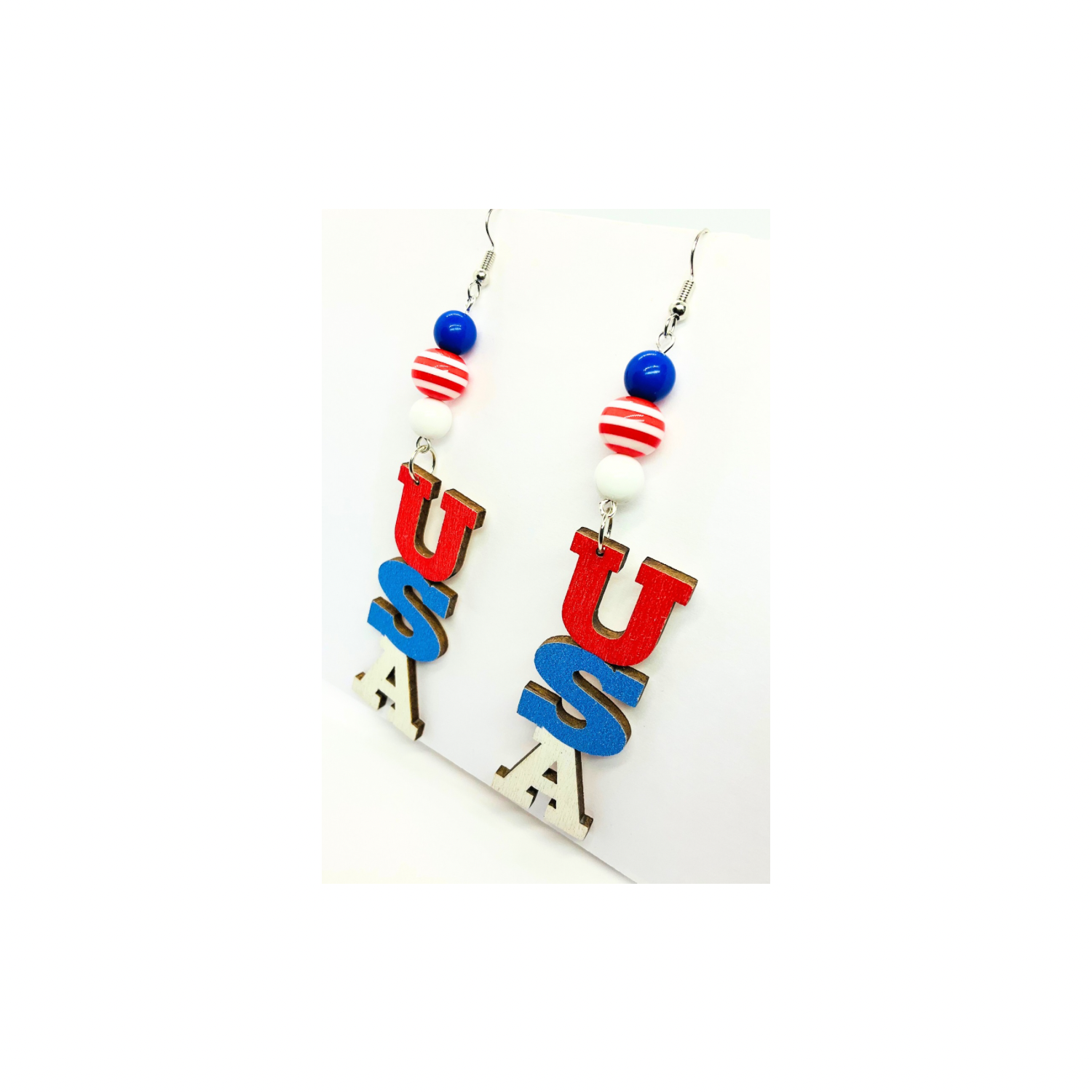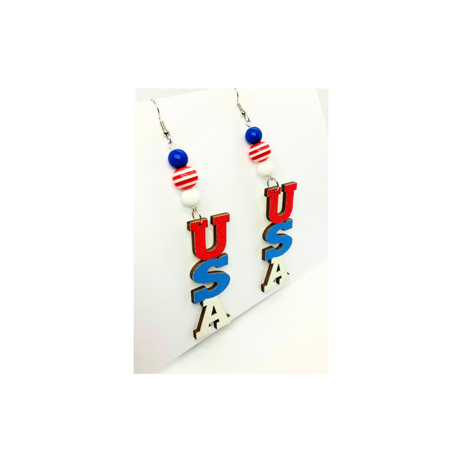 These earrings are part of the Patriotic Collection USA. They feature a wood design with bead dangles, perfect for women. The vibrant red, white, and blue colors add a colorful flair. Ideal for those who love a touch of Americana in their accessories.