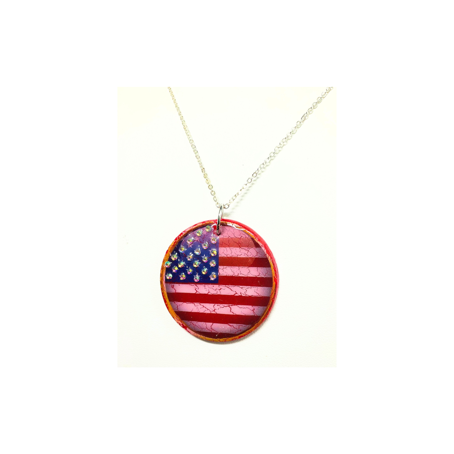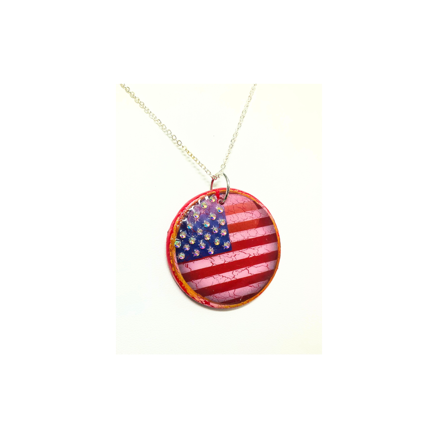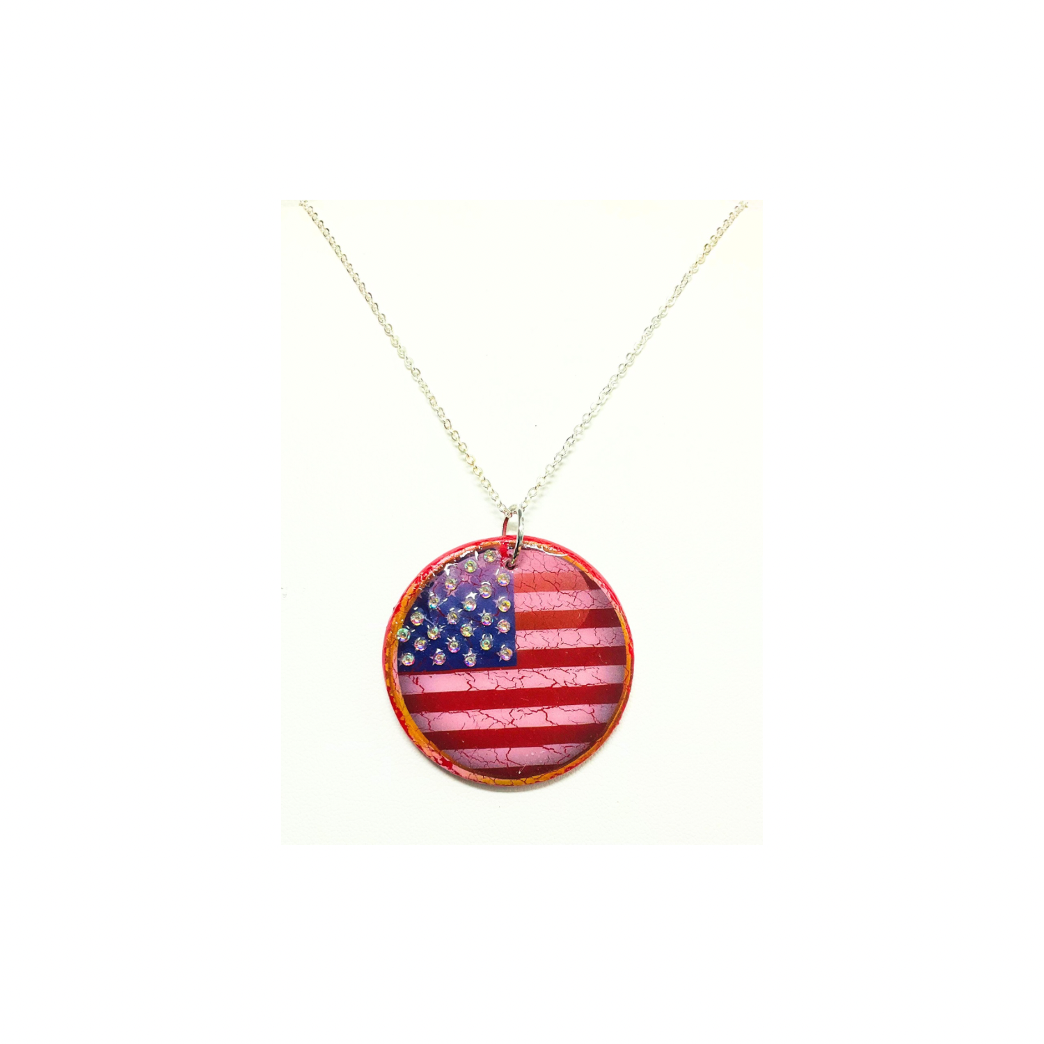 This necklace features a patriotic red, white, and blue round pendant adorned with rhinestone stars. It's crafted from polymer clay, sealed with UV resin for durability. The pendant hangs elegantly on an 18-inch silver chain. Each piece is handmade, ensuring uniqueness. No two items are identical, making every piece special.