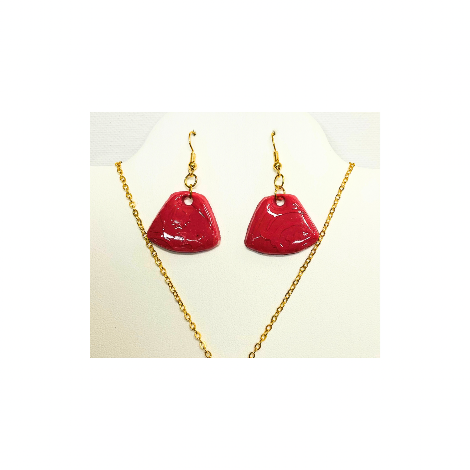 This unique jewelry set features a handmade polymer clay dragonfly charm pendant and gold chain drop earrings. Each piece is carefully crafted, ensuring a one-of-a-kind design. The set is finished with a beautiful shine using resin, making it a standout accessory.