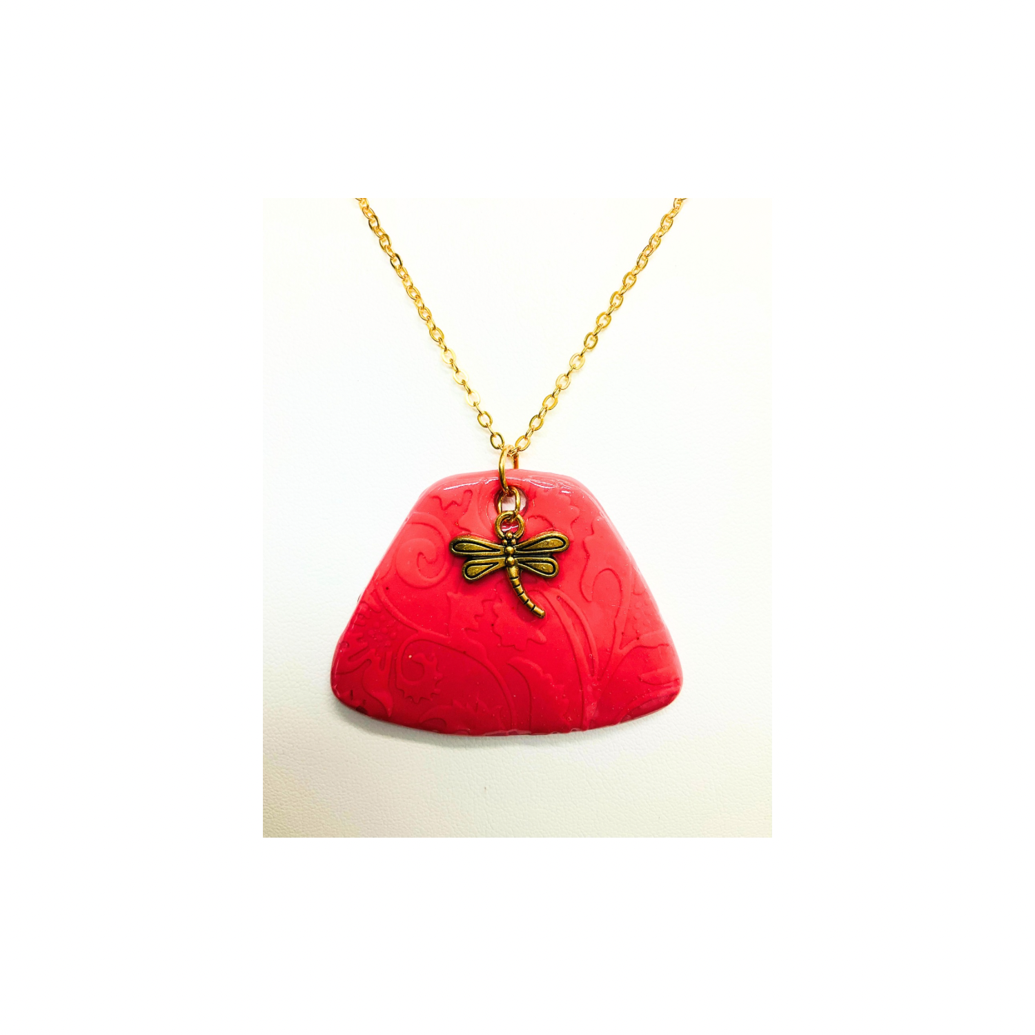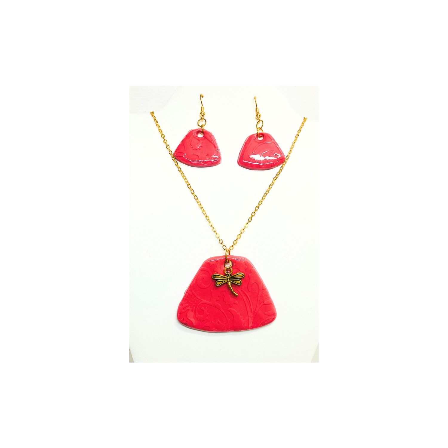 Pink Brick Jewelry Set Dragonfly Charm Pendant & Gold Chain Earrings Unique One-of-a-Kind Design