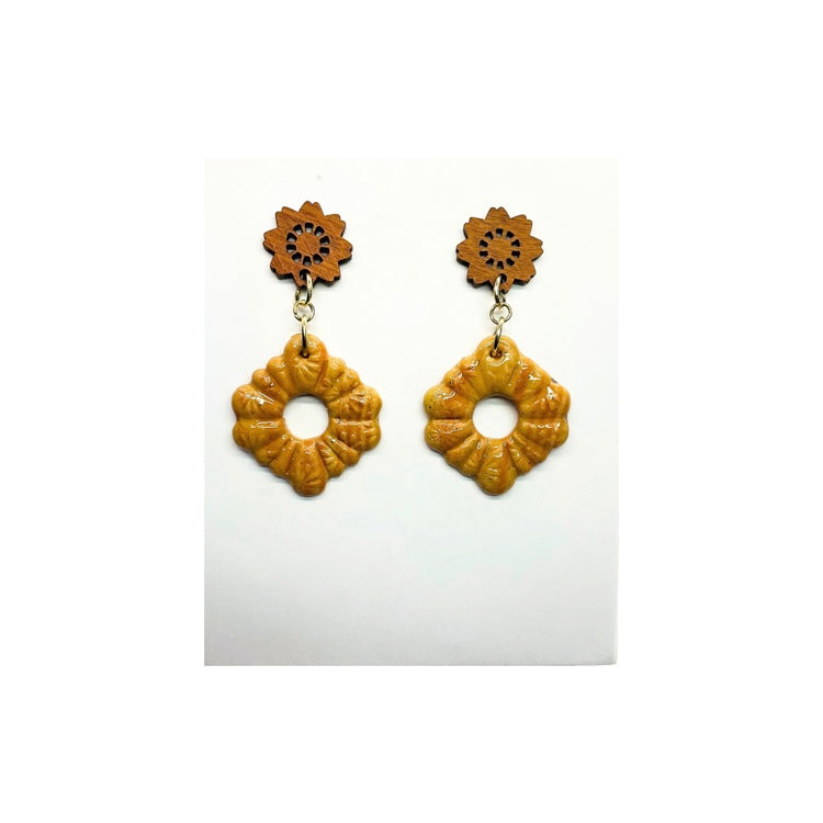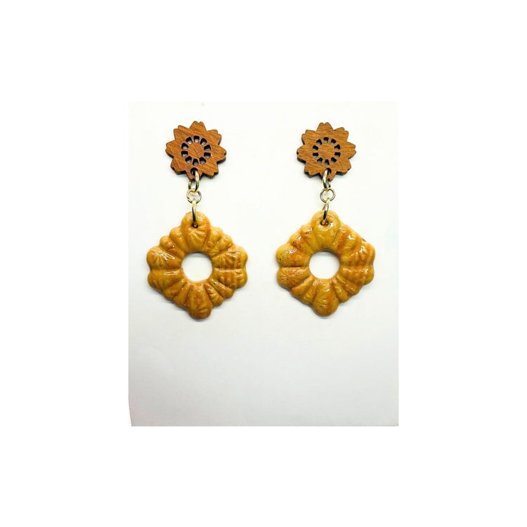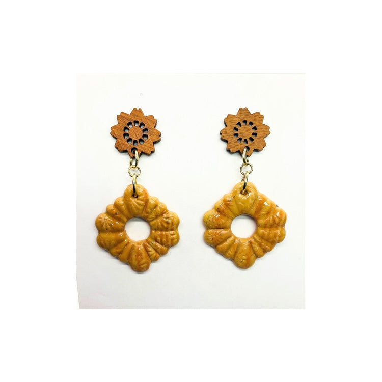 Pink Dangle Earring with Wood Flower Ear Stud - Unique Design Pink Circular Motif Earrings