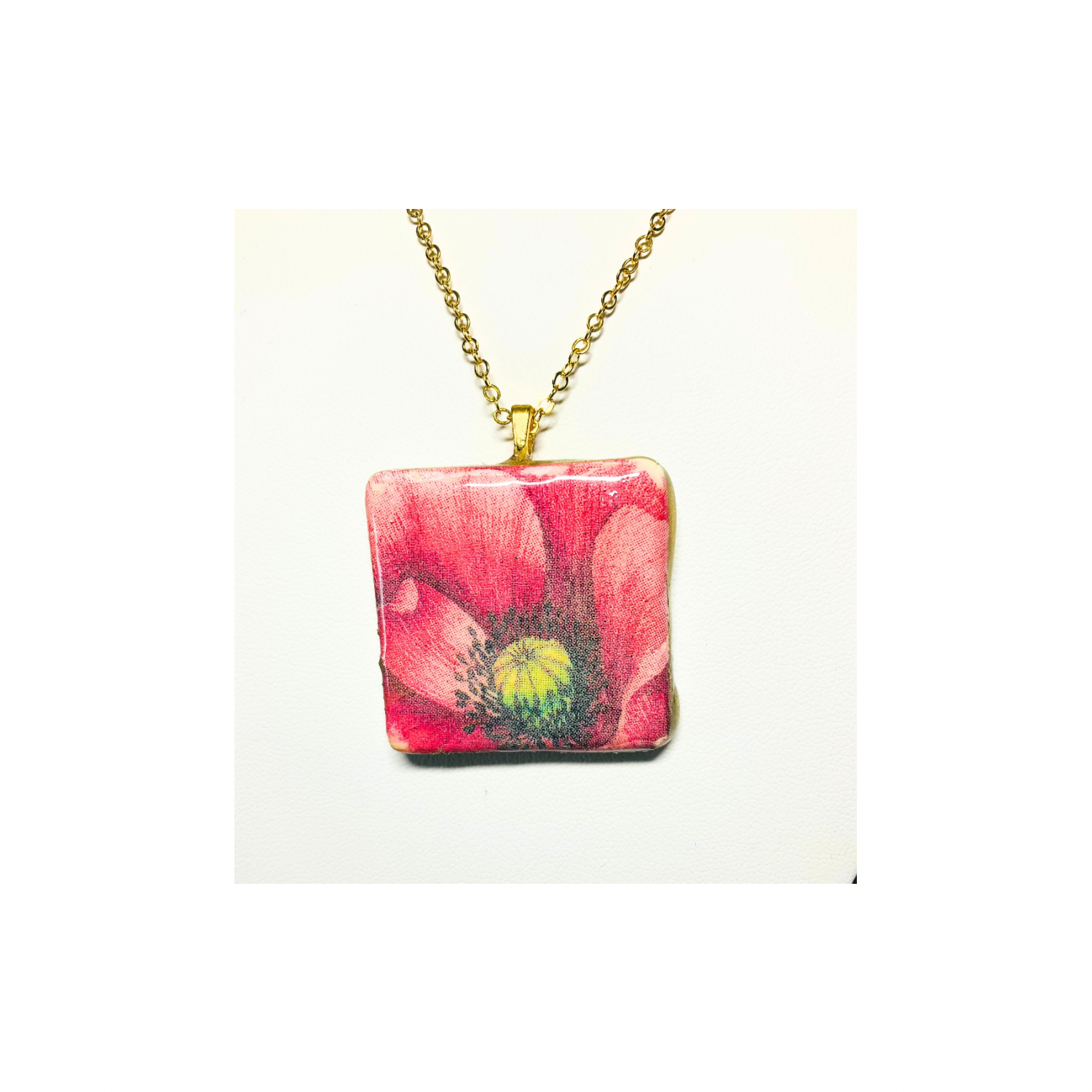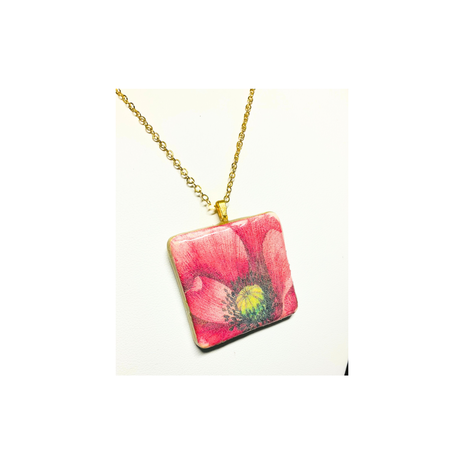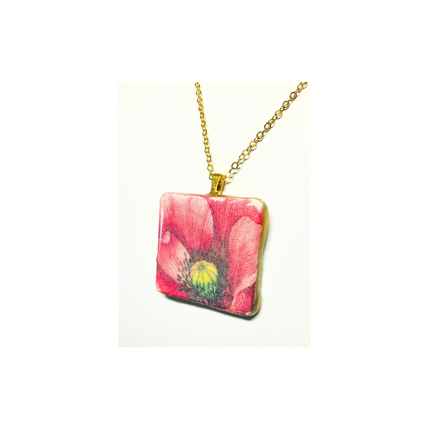 Pink Flower Clay Square Pendant Necklace - Trendy Cute Style Pink Handcrafted Lightweight for Everyday Wear