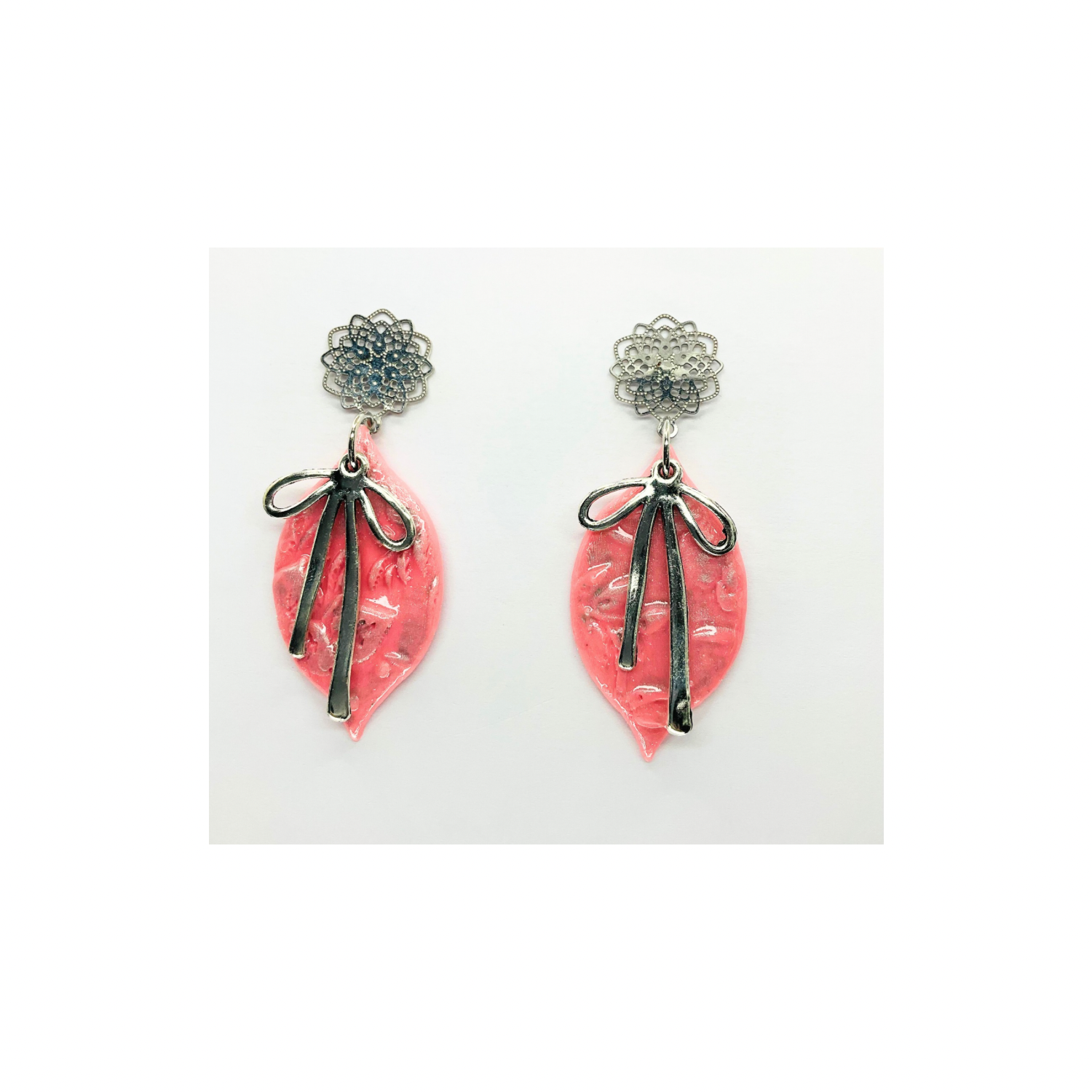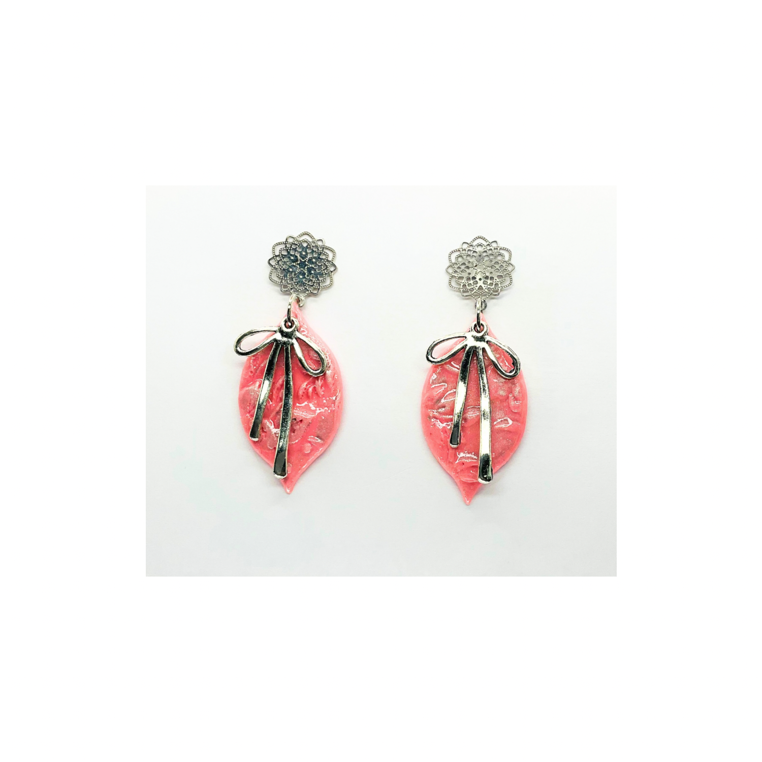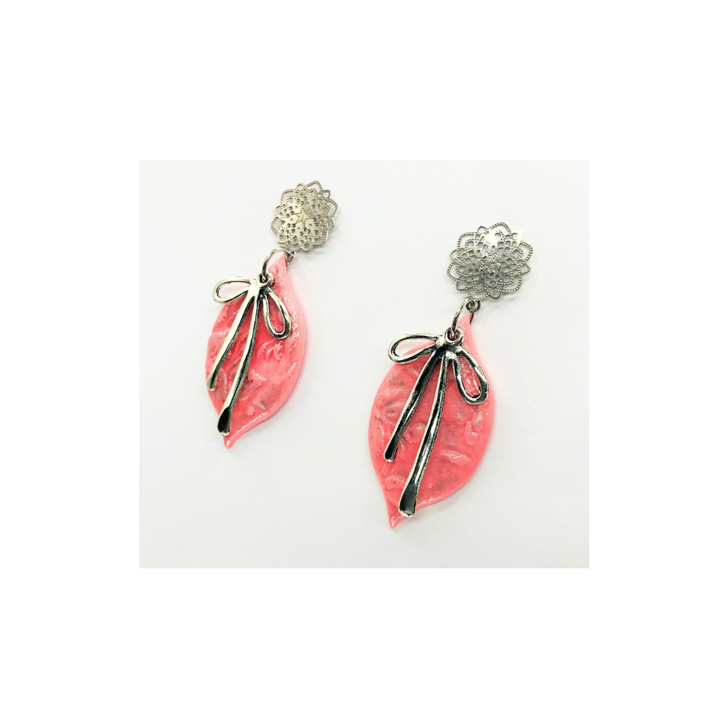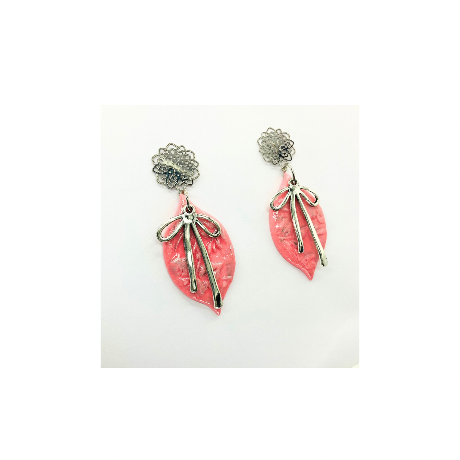 - Material:Β The earrings feature a pink ornament, a silver bow, and a filigree stud. πΈ
