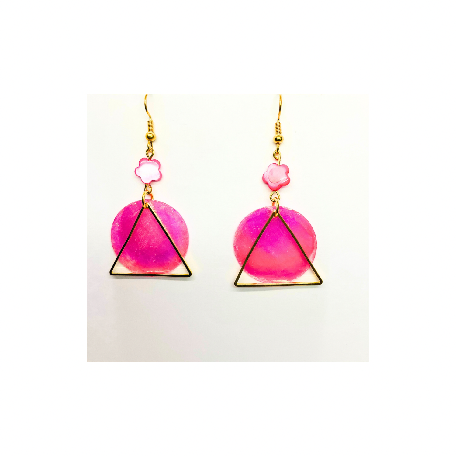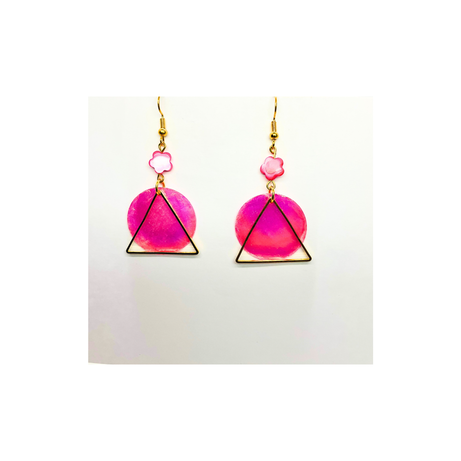 Pink Shell Collection Bright Pink Circle with Gold Triangle Dangle Earrings for Female Fashion Jewelry