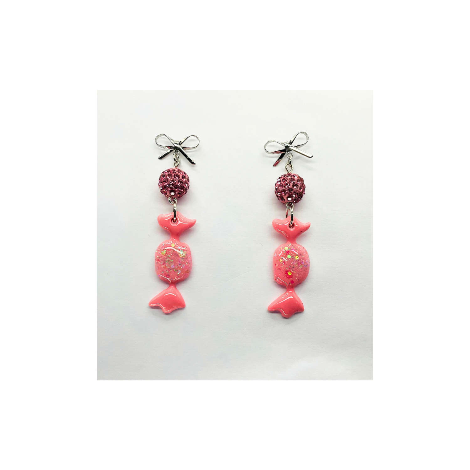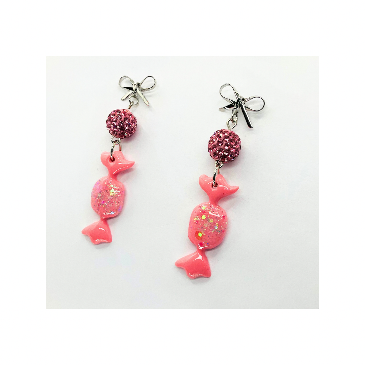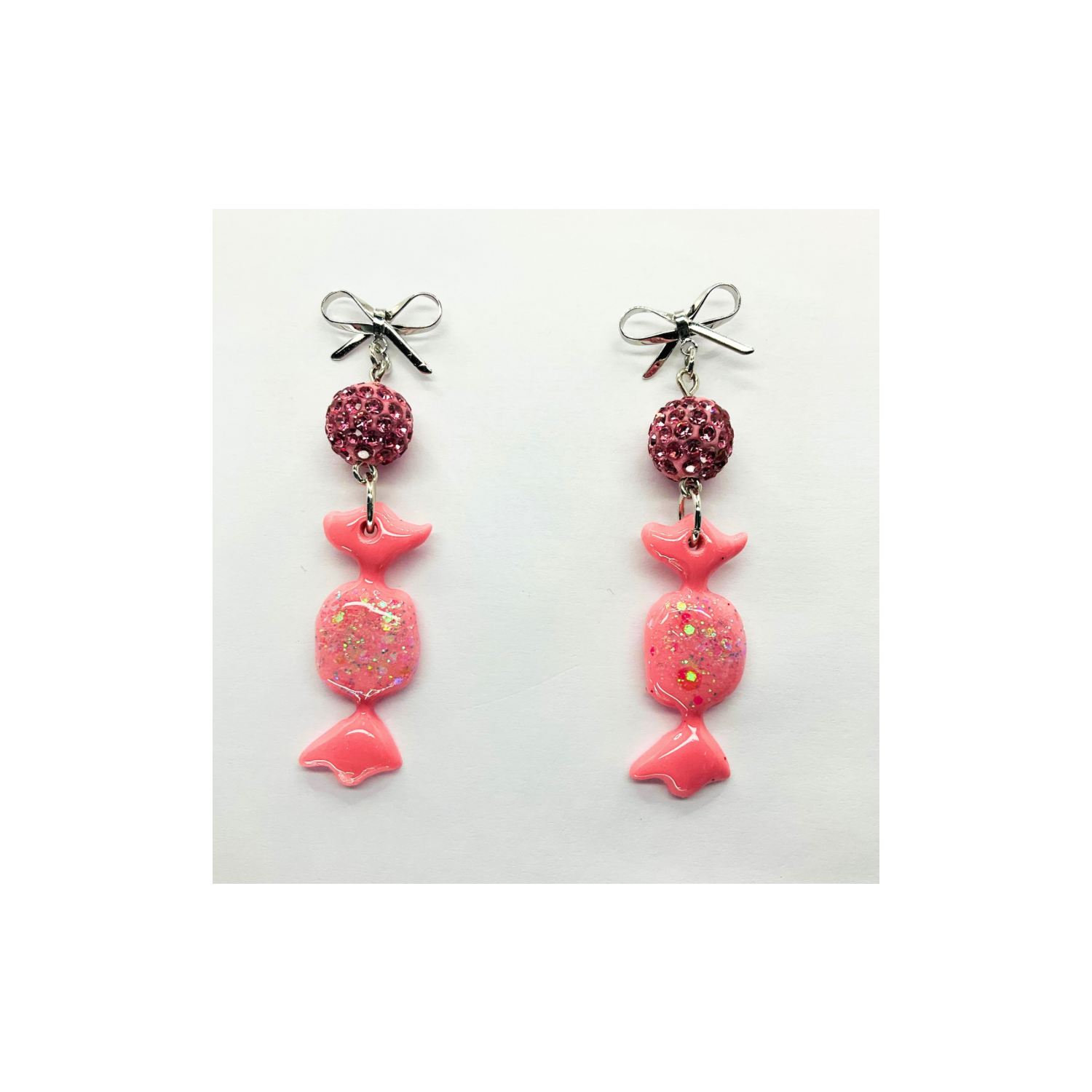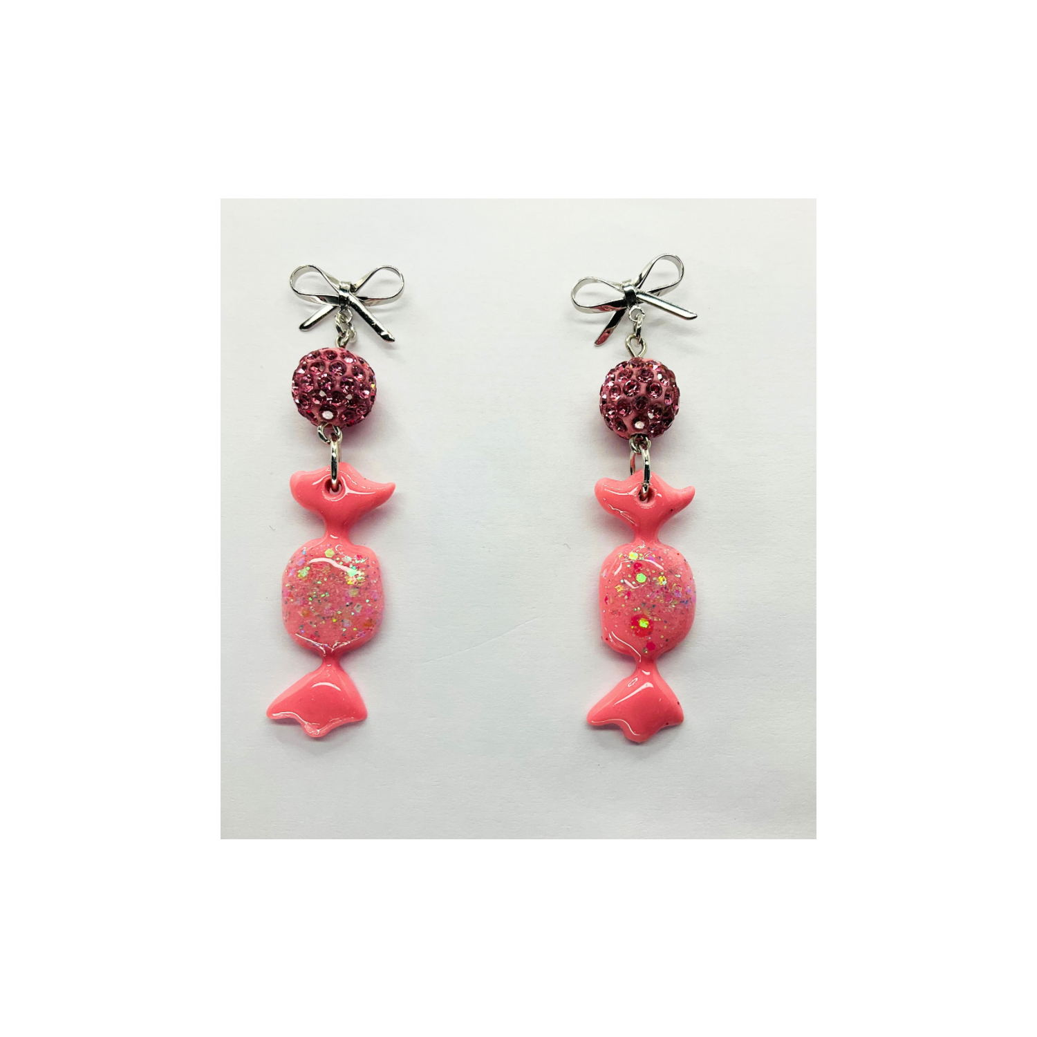 - Usage: Ideal for festive occasions, these earrings complement any outfit. The combination of the pink candy wrap and silver bow creates a charming look. Enhance your festive ensemble with these unique earrings. π