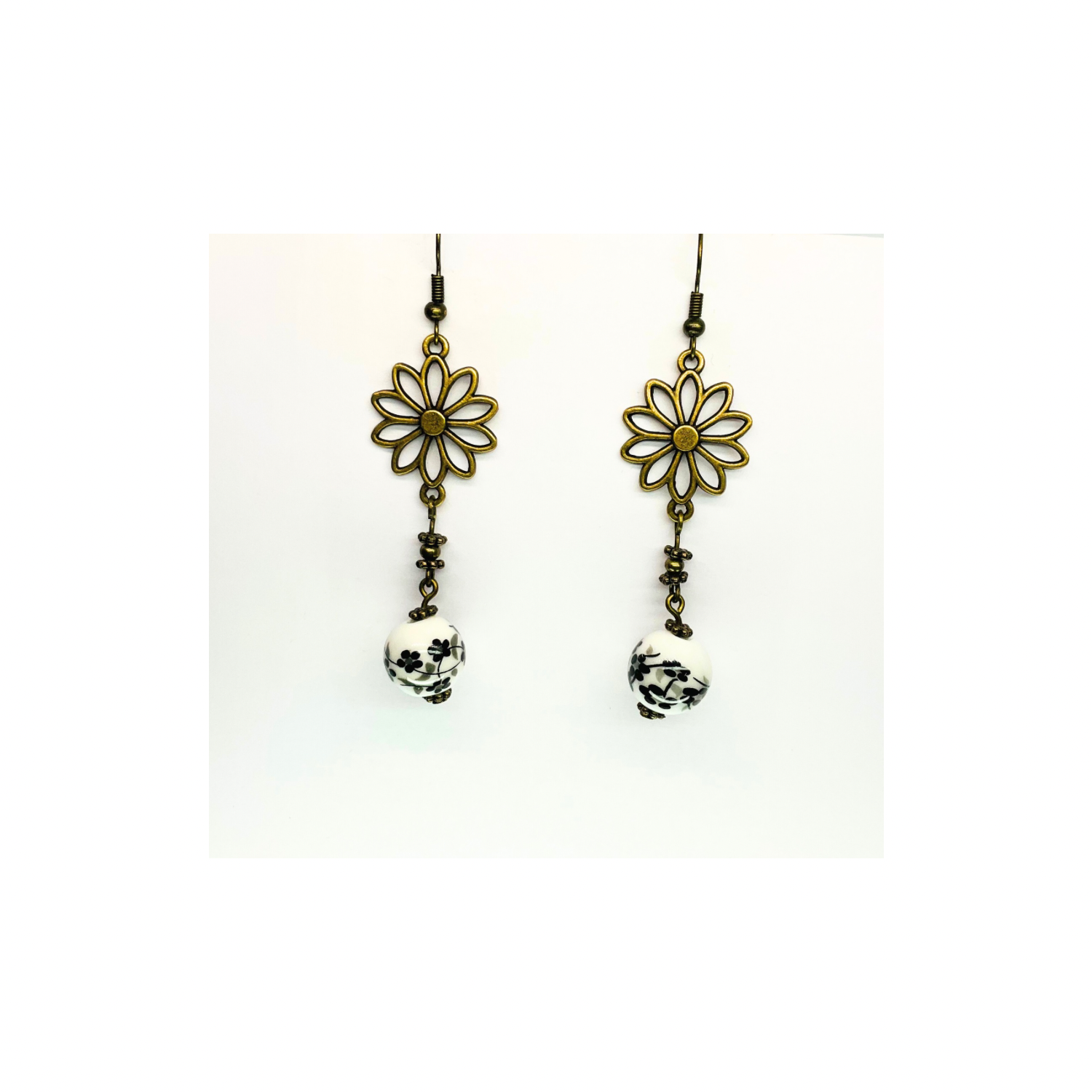 Porcelain Bead Collection Daisy Bronze Dangle Earrings