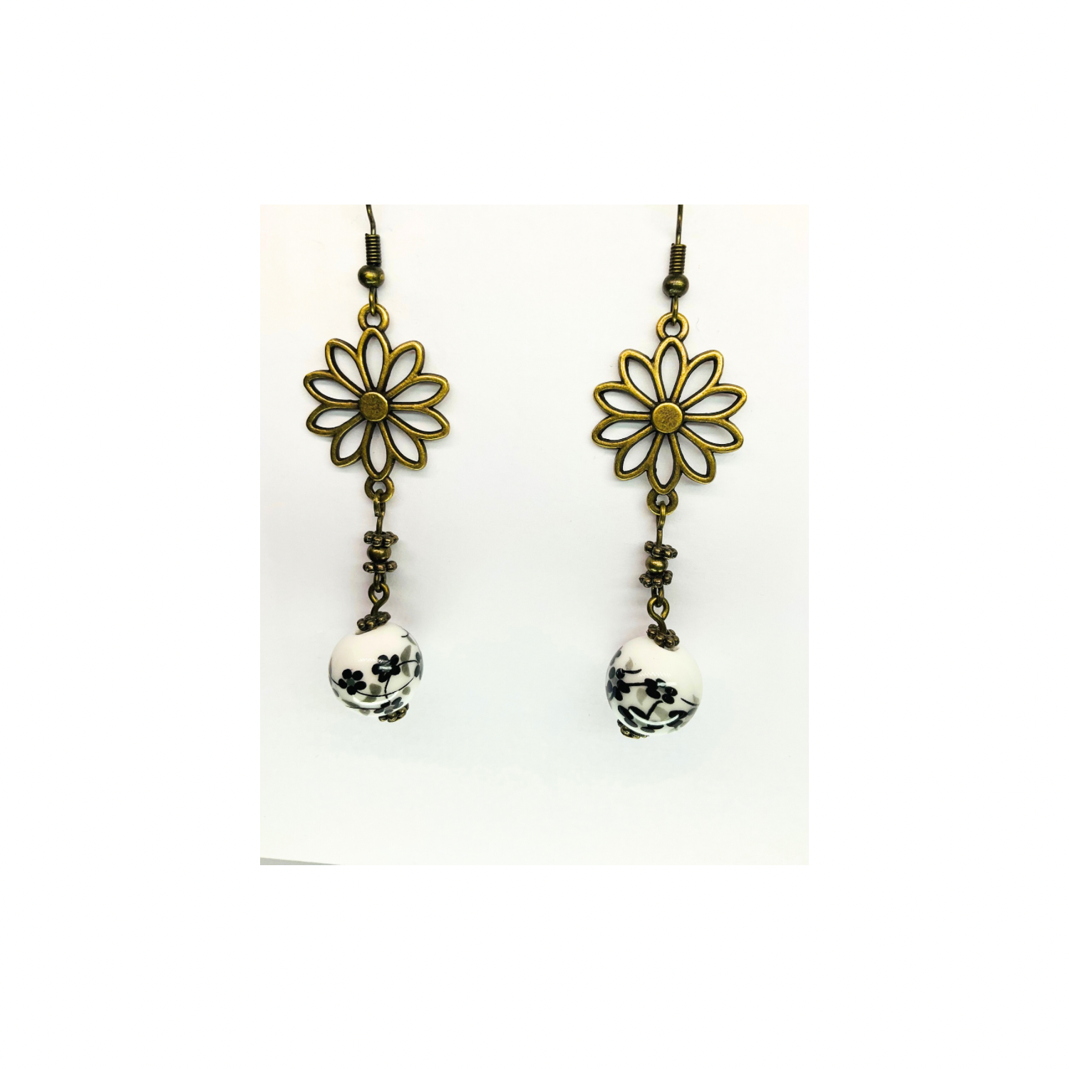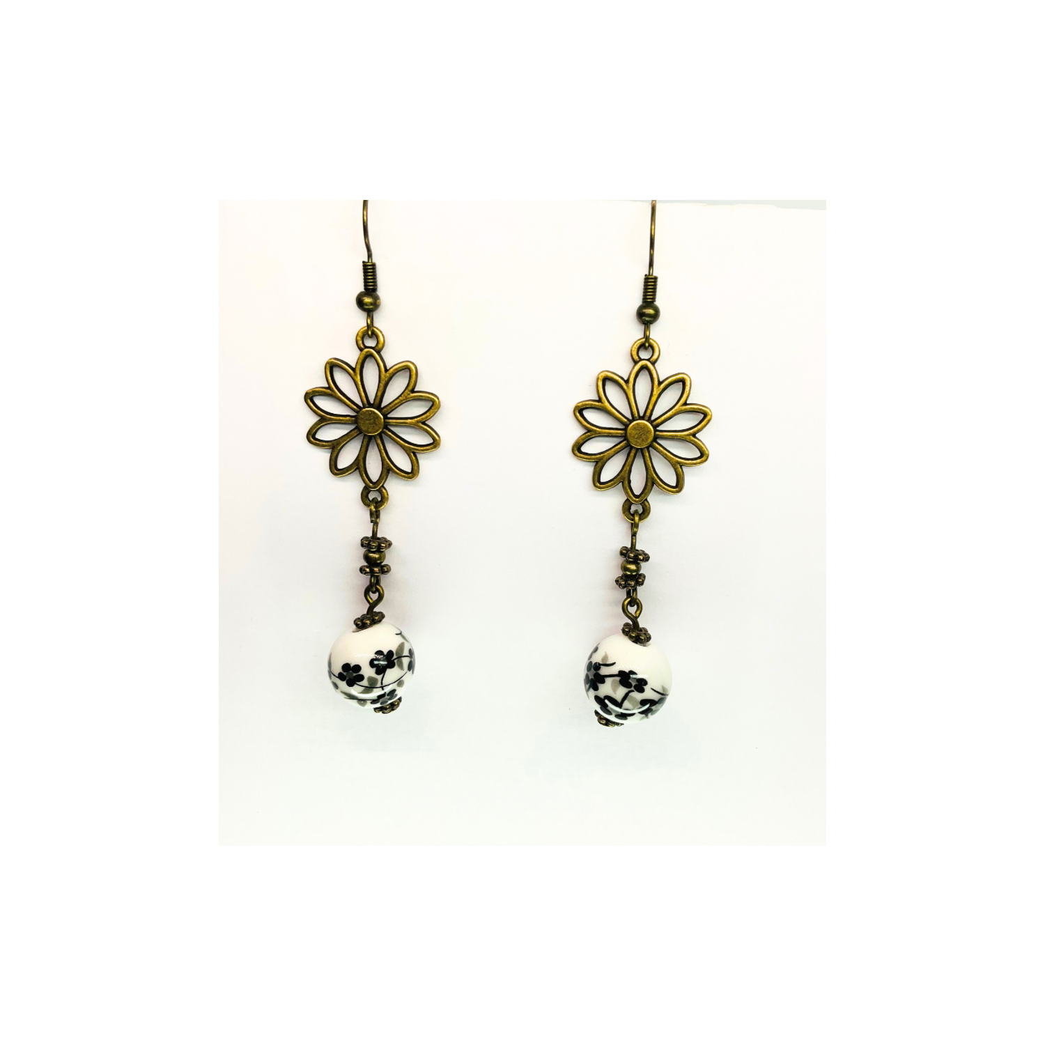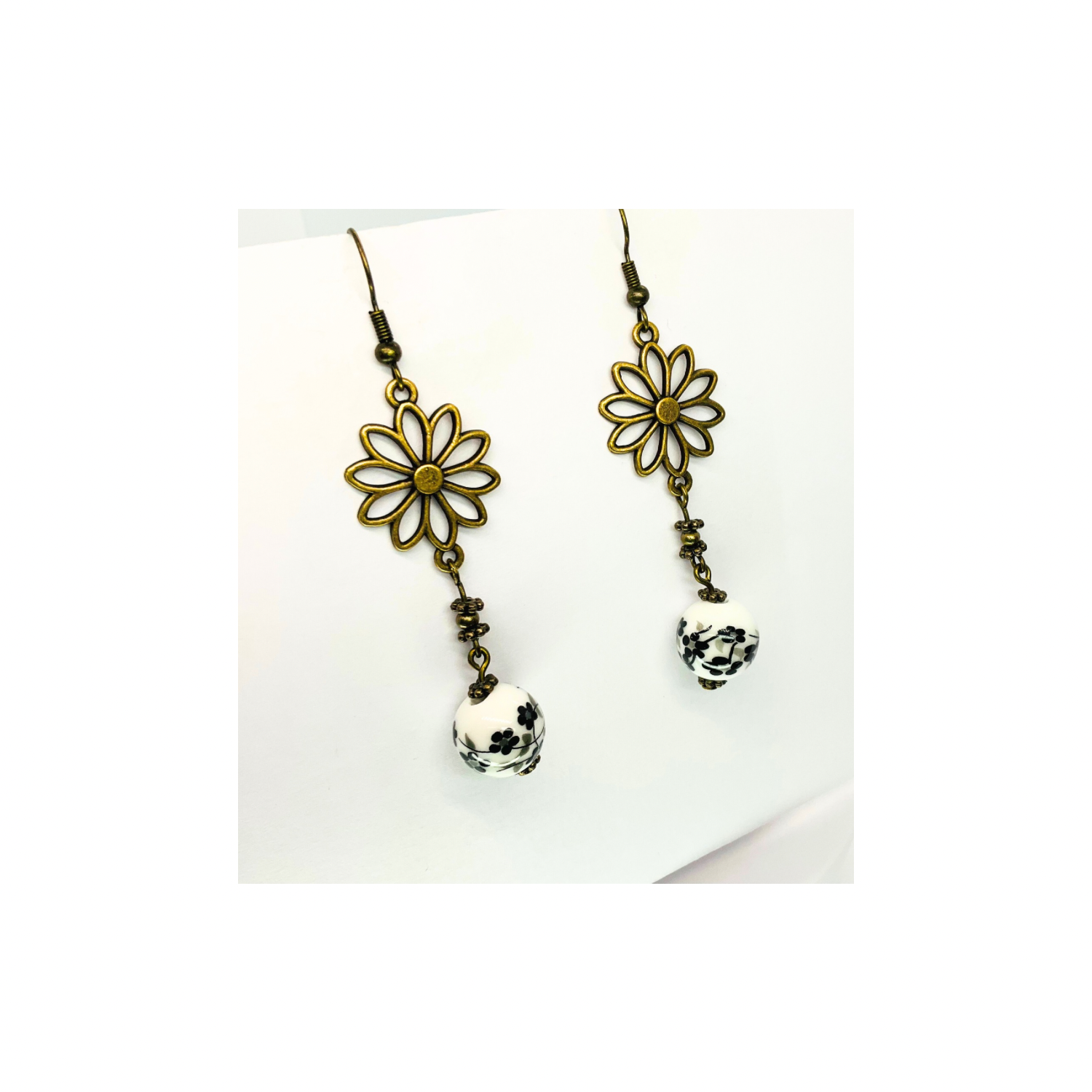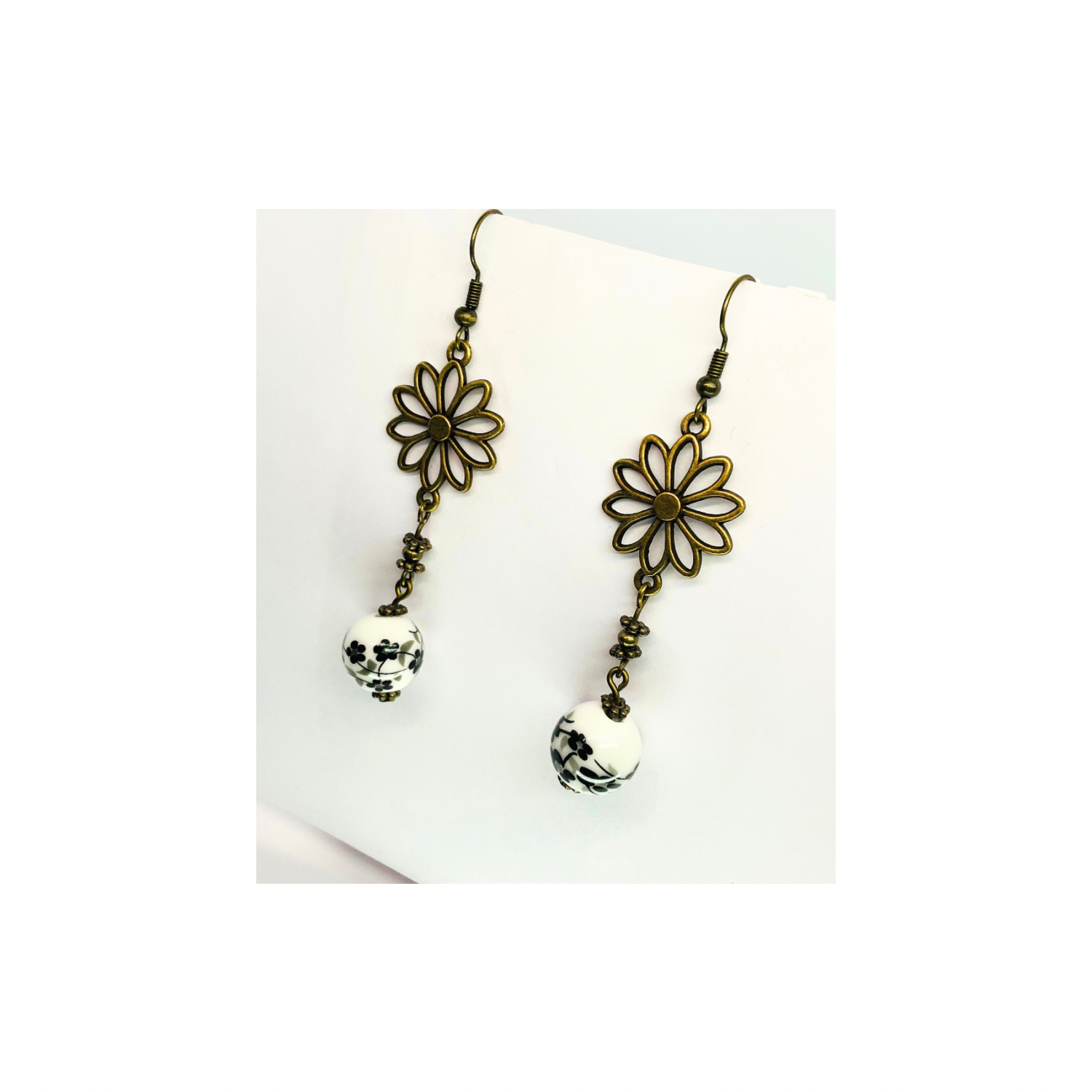 Porcelain Bead Collection Daisy Bronze Dangle Earrings with Floral Design and Porcelain Beads