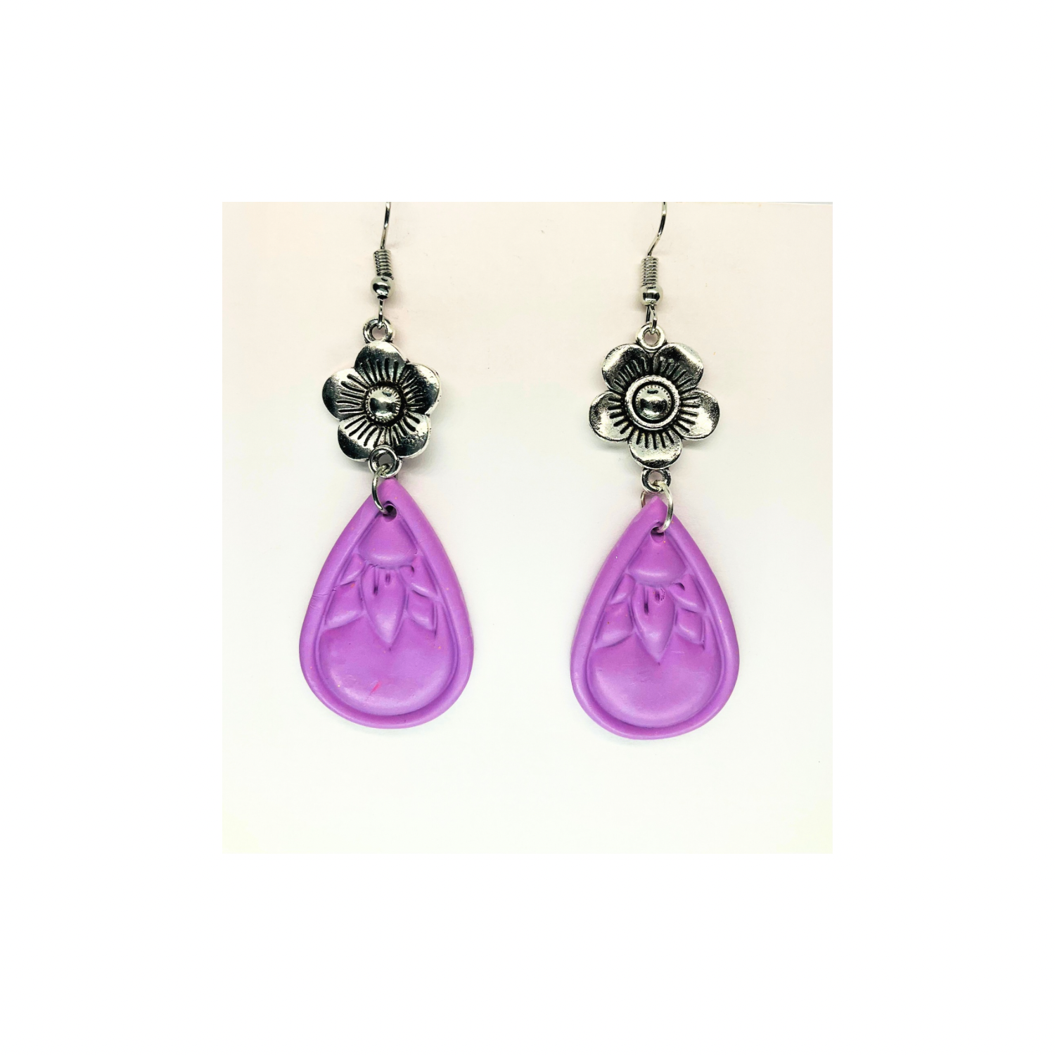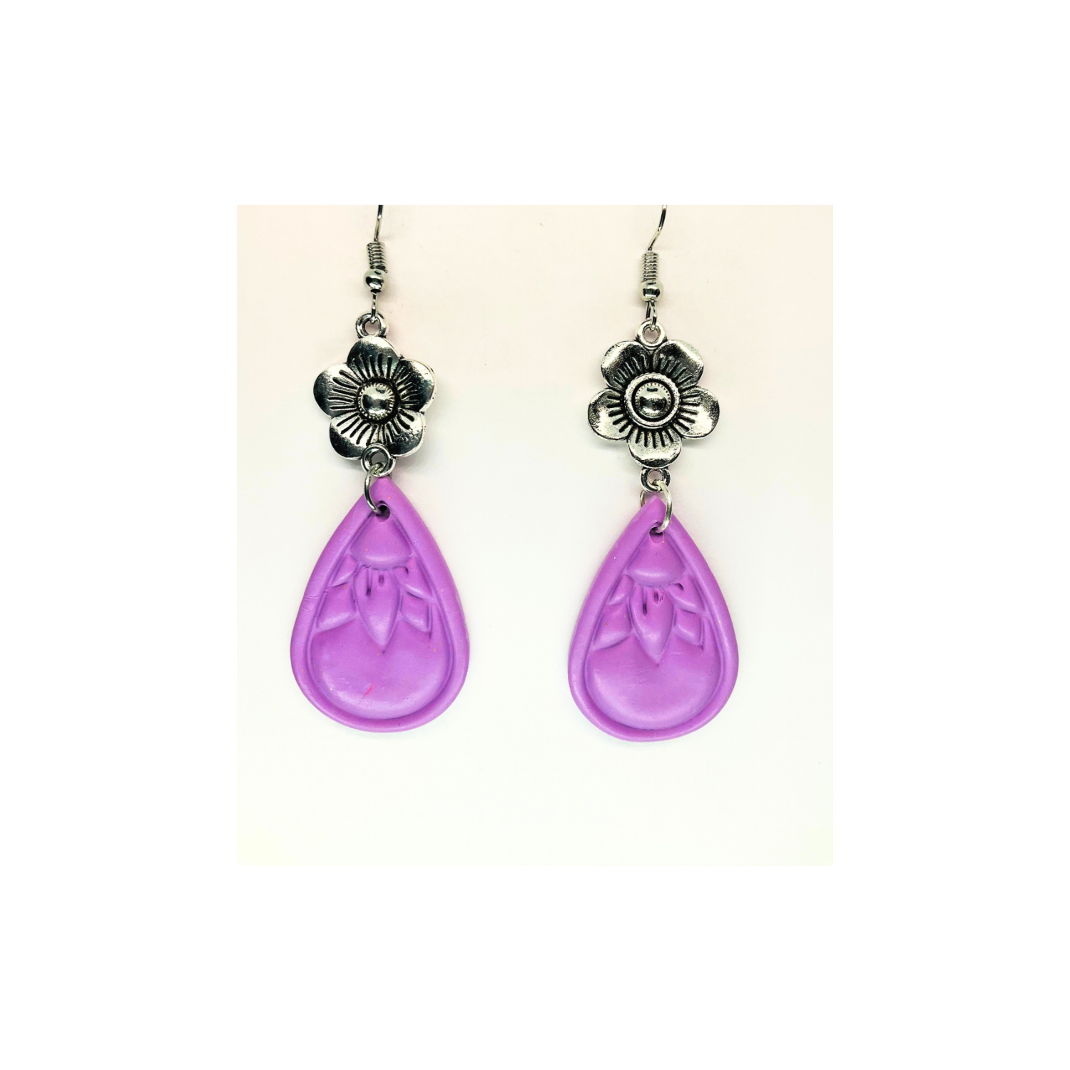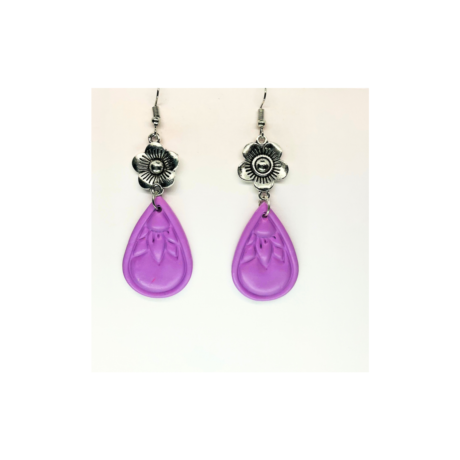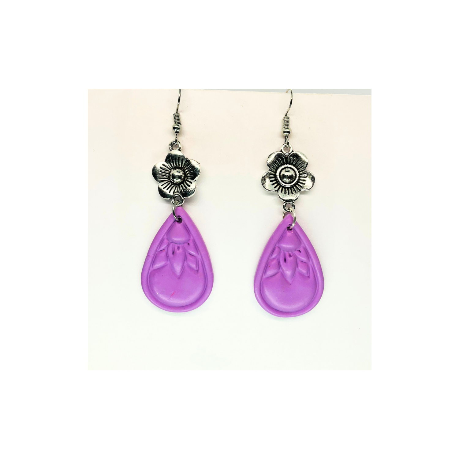 These earrings feature a distinctive teardrop shape, adding a touch of elegance to any outfit. The vibrant purple hue of the sunflower design stands out, making it a standout accessory. Perfect for those who appreciate unique, eye-catching jewelry. The silver flower dangle complements the purple sunflower, creating a harmonious look.