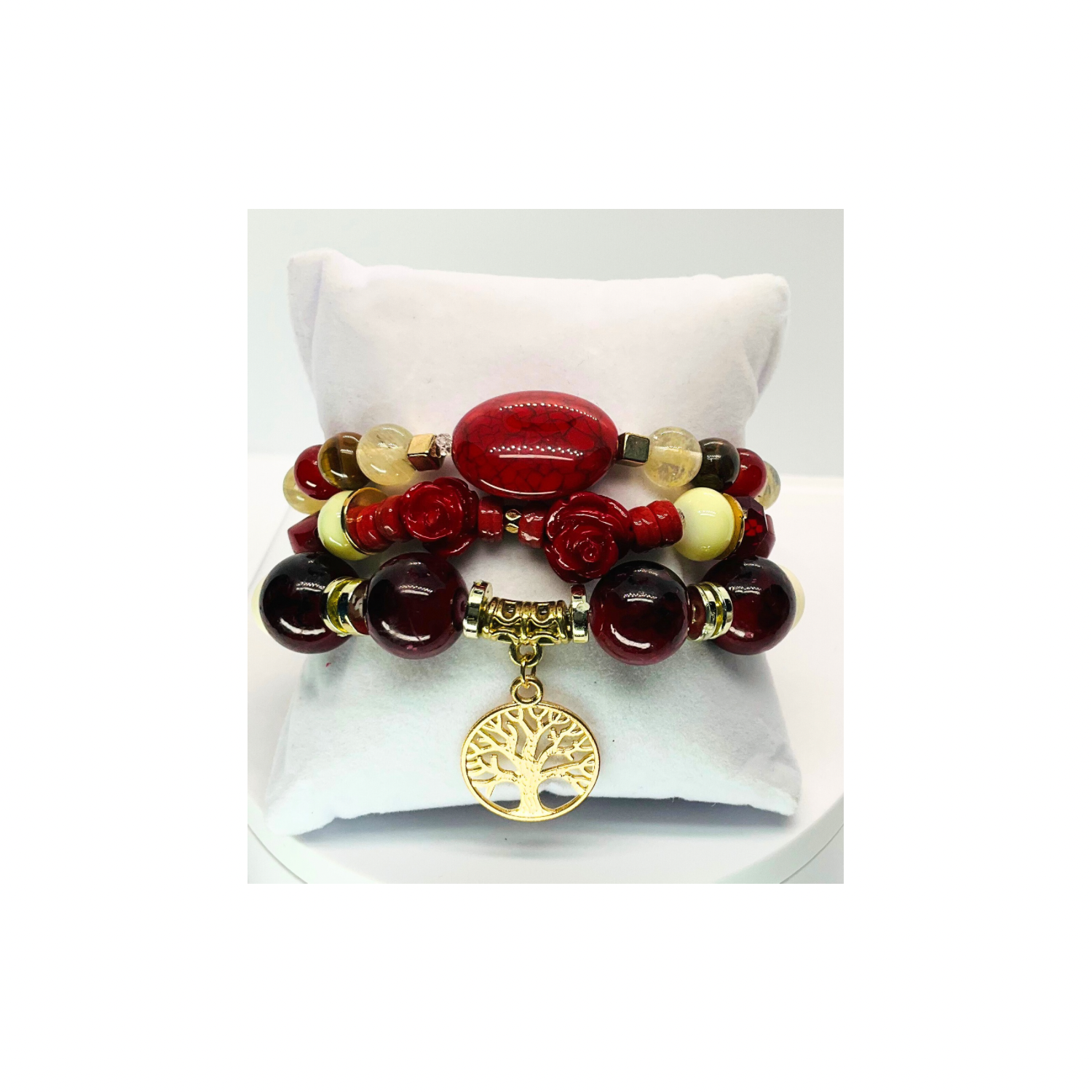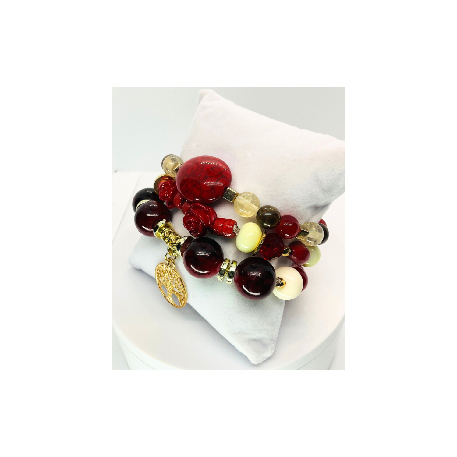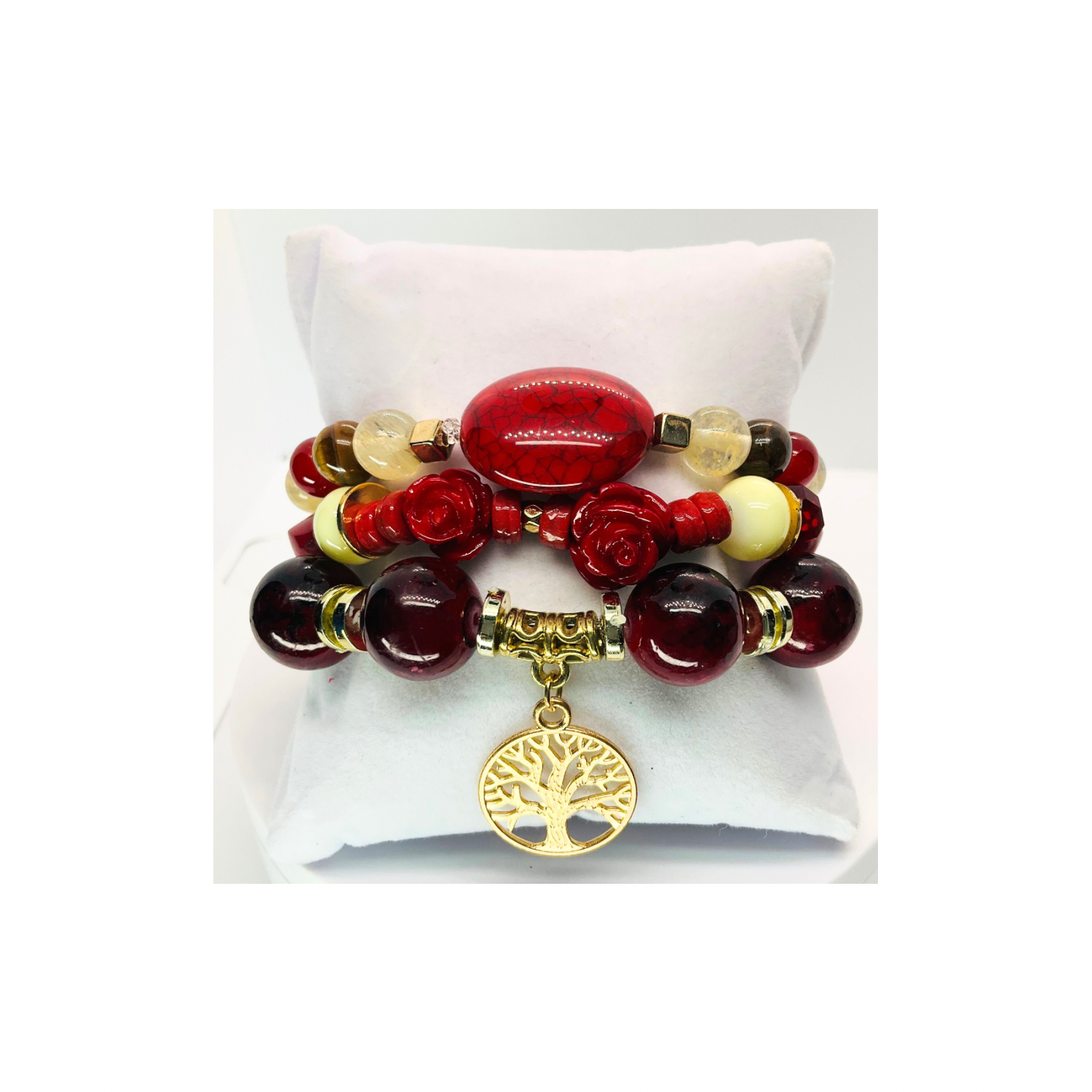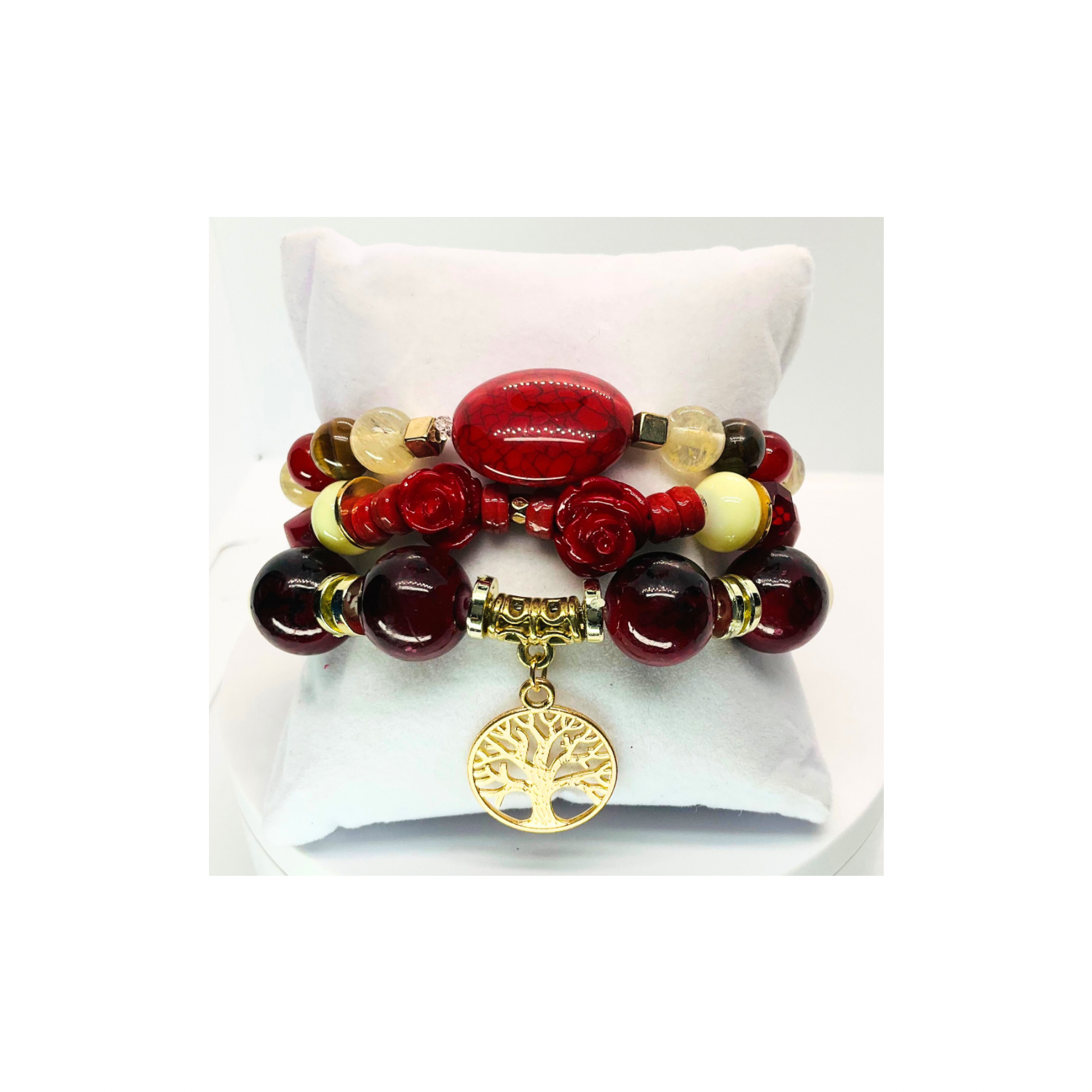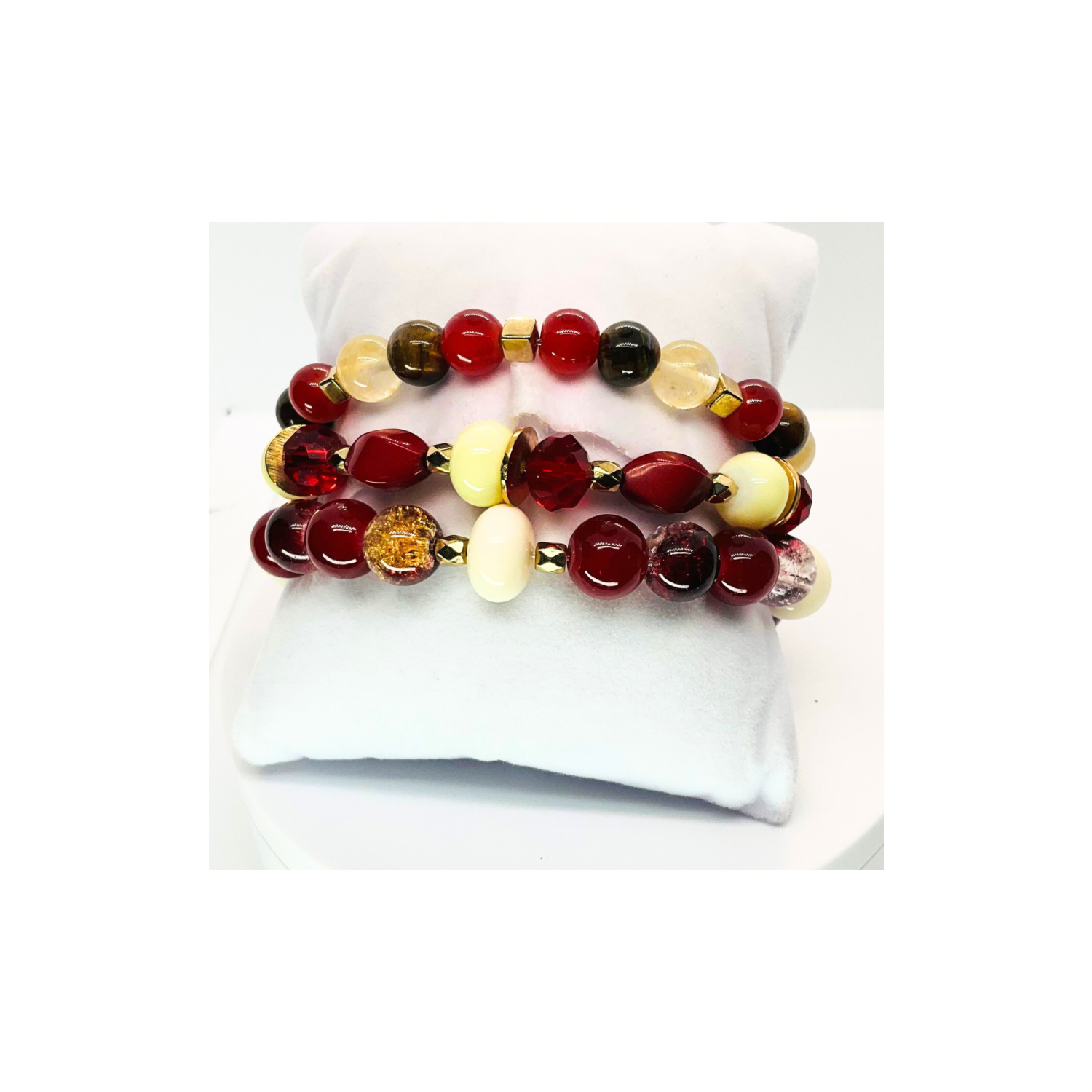 - Set Includes: Three stretch beaded bracelets in red and gold colors. π