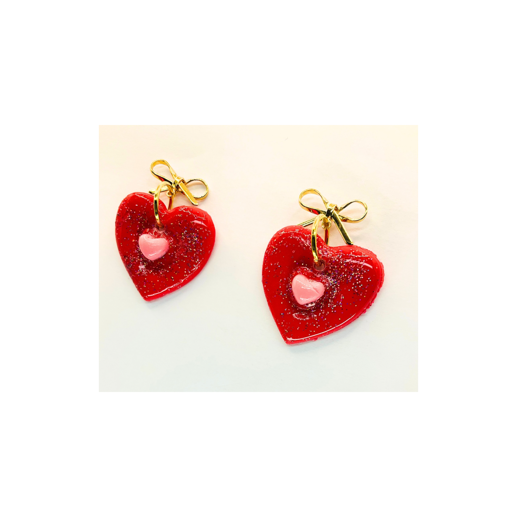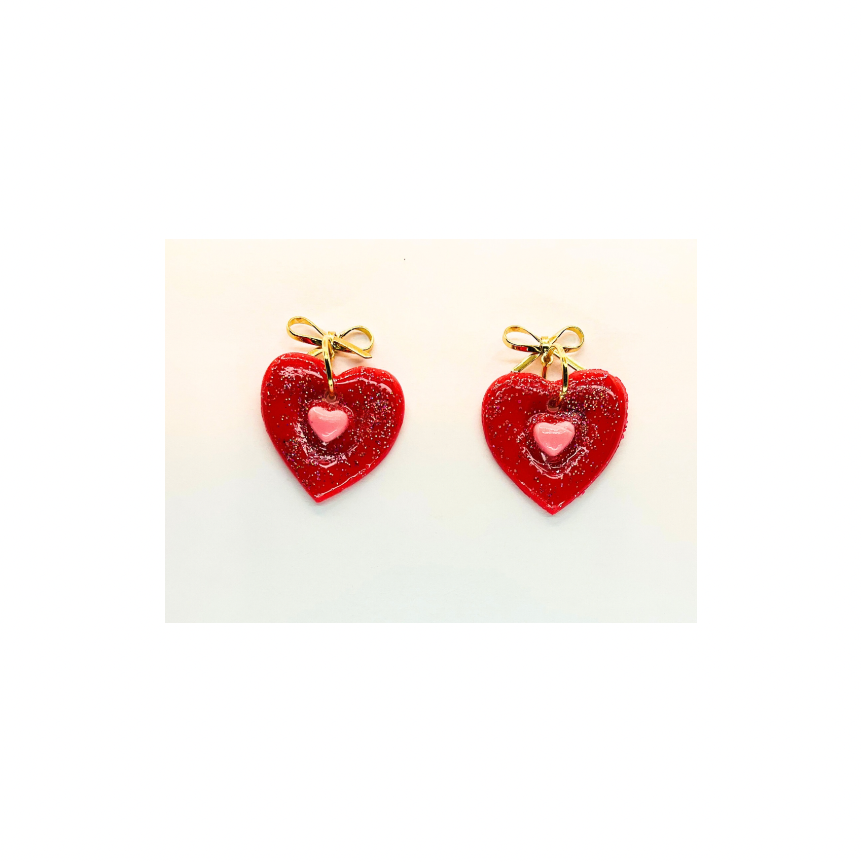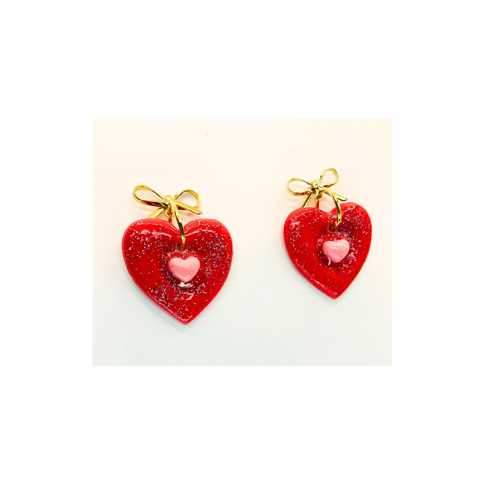 Red Heart with Pink Heart and Gold Bow Stud Dangle Earring