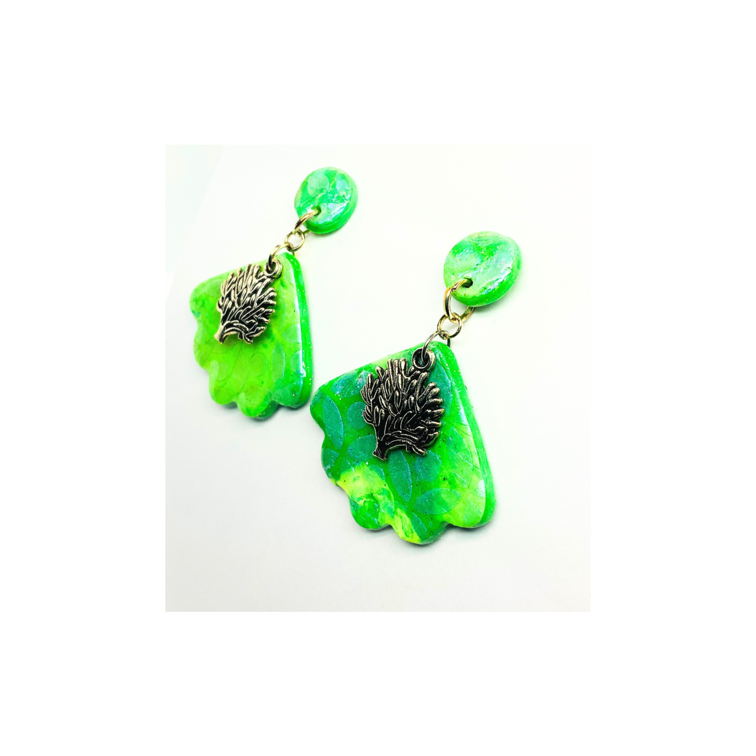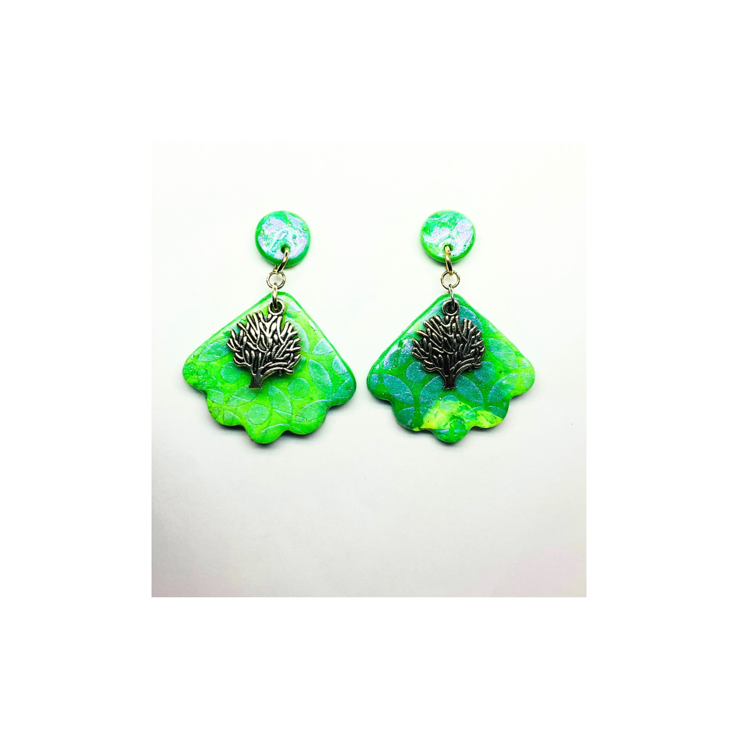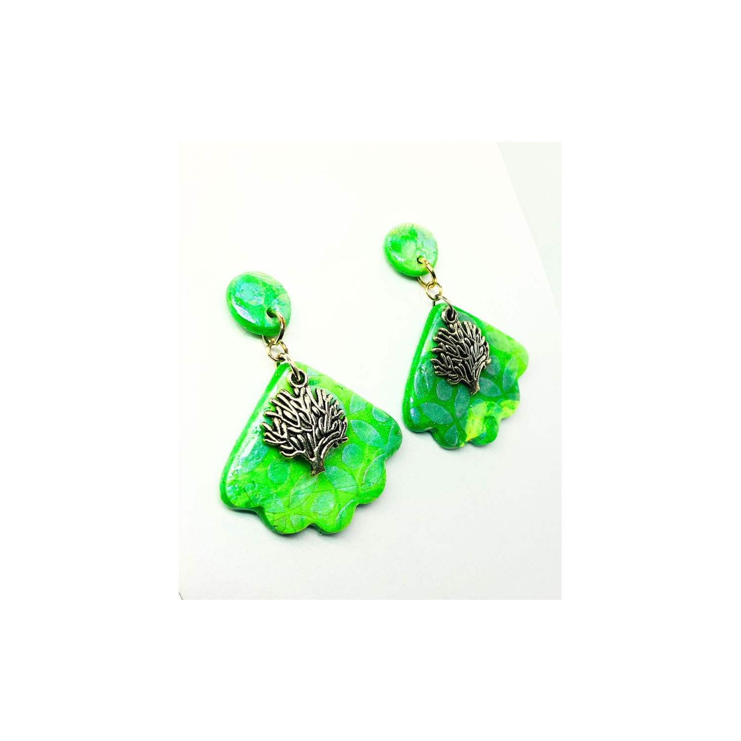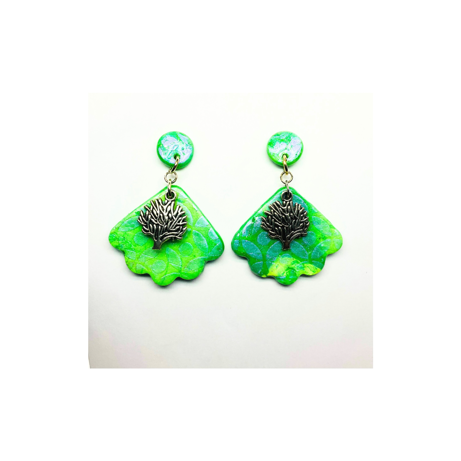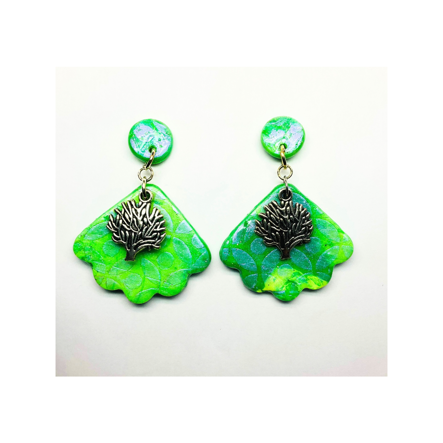 โจ Elegant Design: These earrings feature shades of green polymer clay with iridescent stenciling. A tree of life silver charm adds a touch of nature's artistry. The UV resin finish ensures a beautiful sheen, sealing the design beautifully.