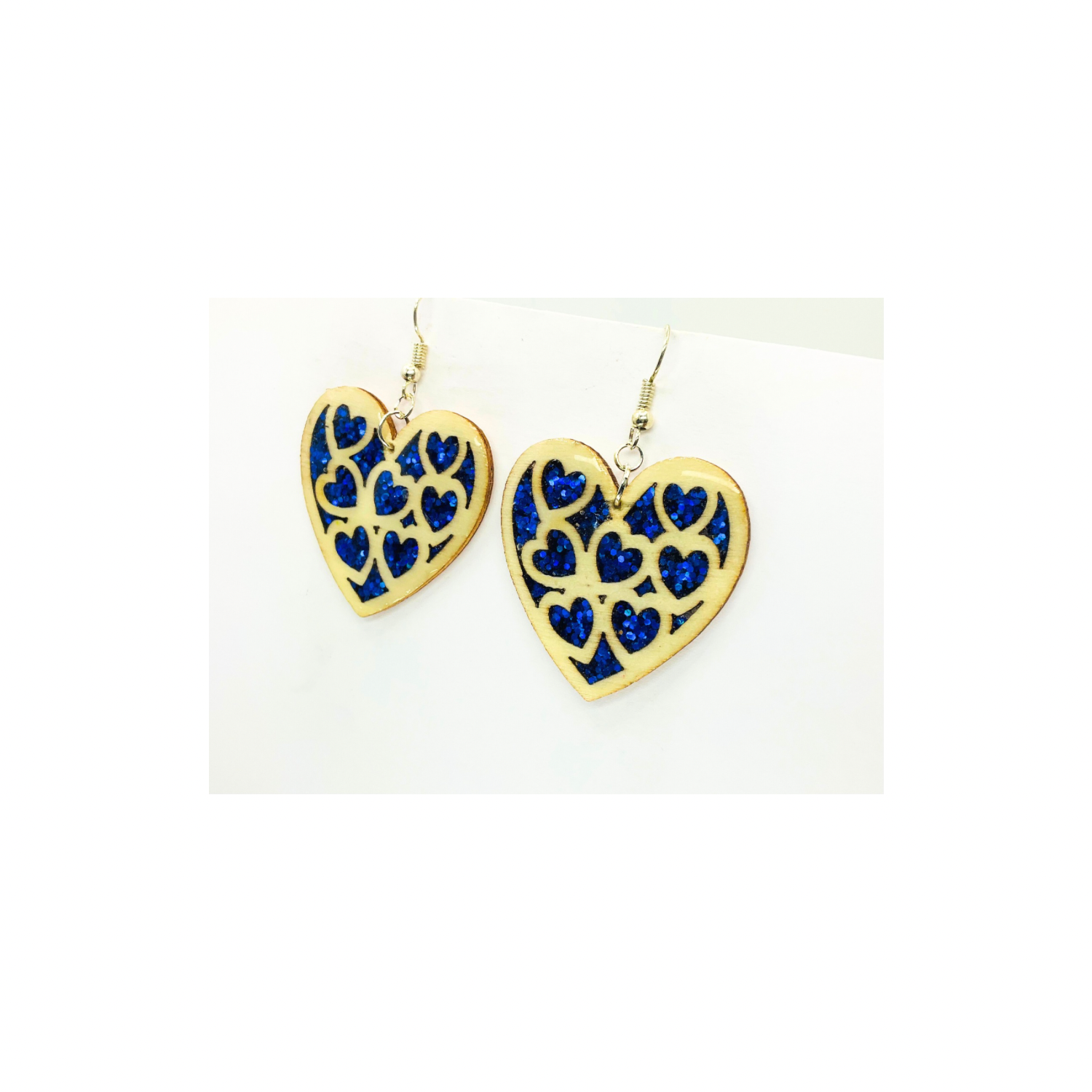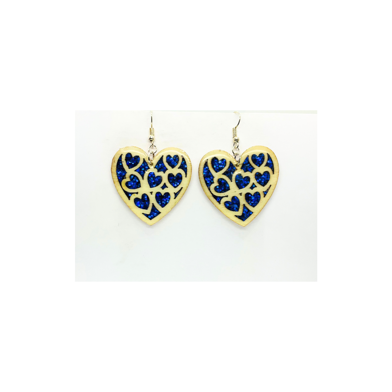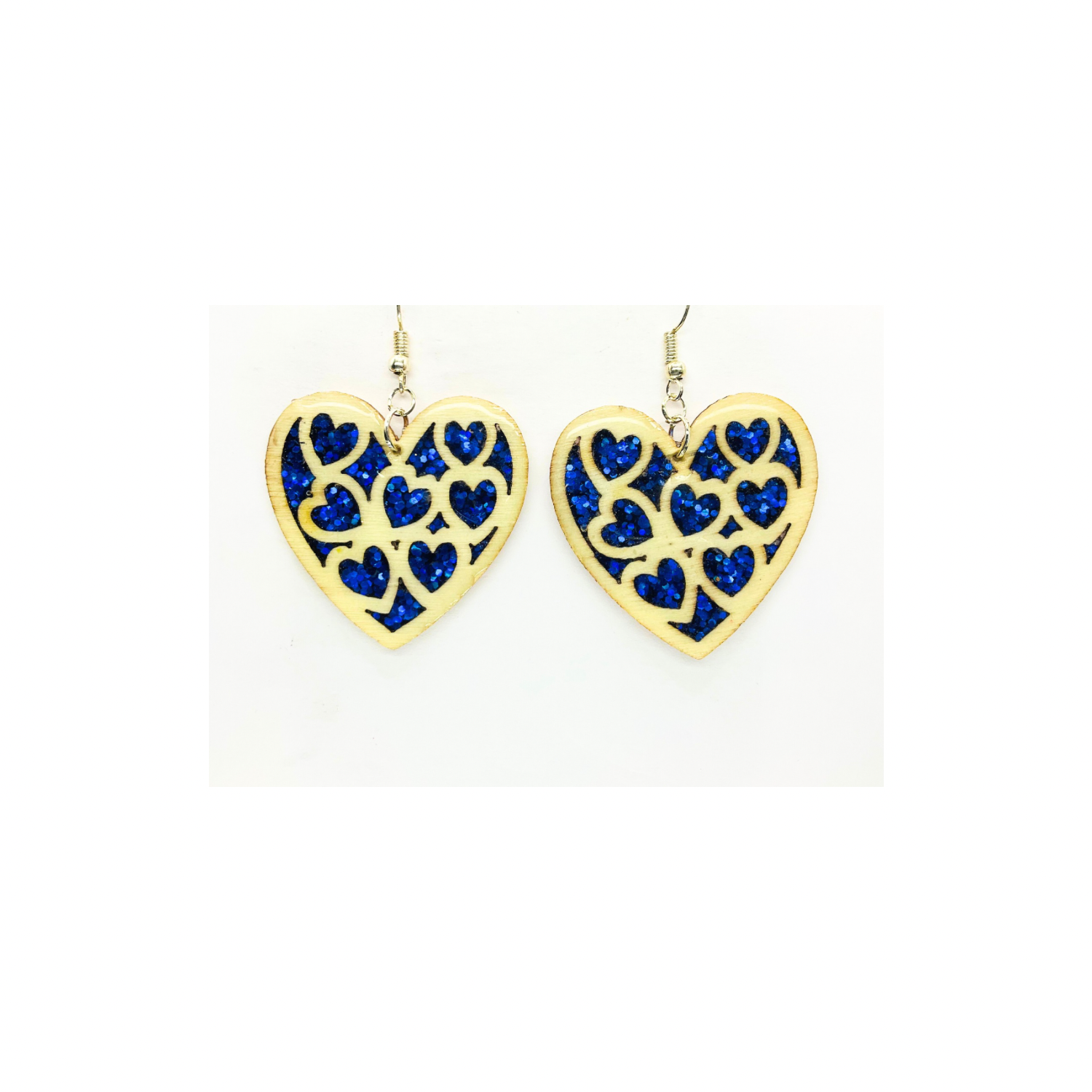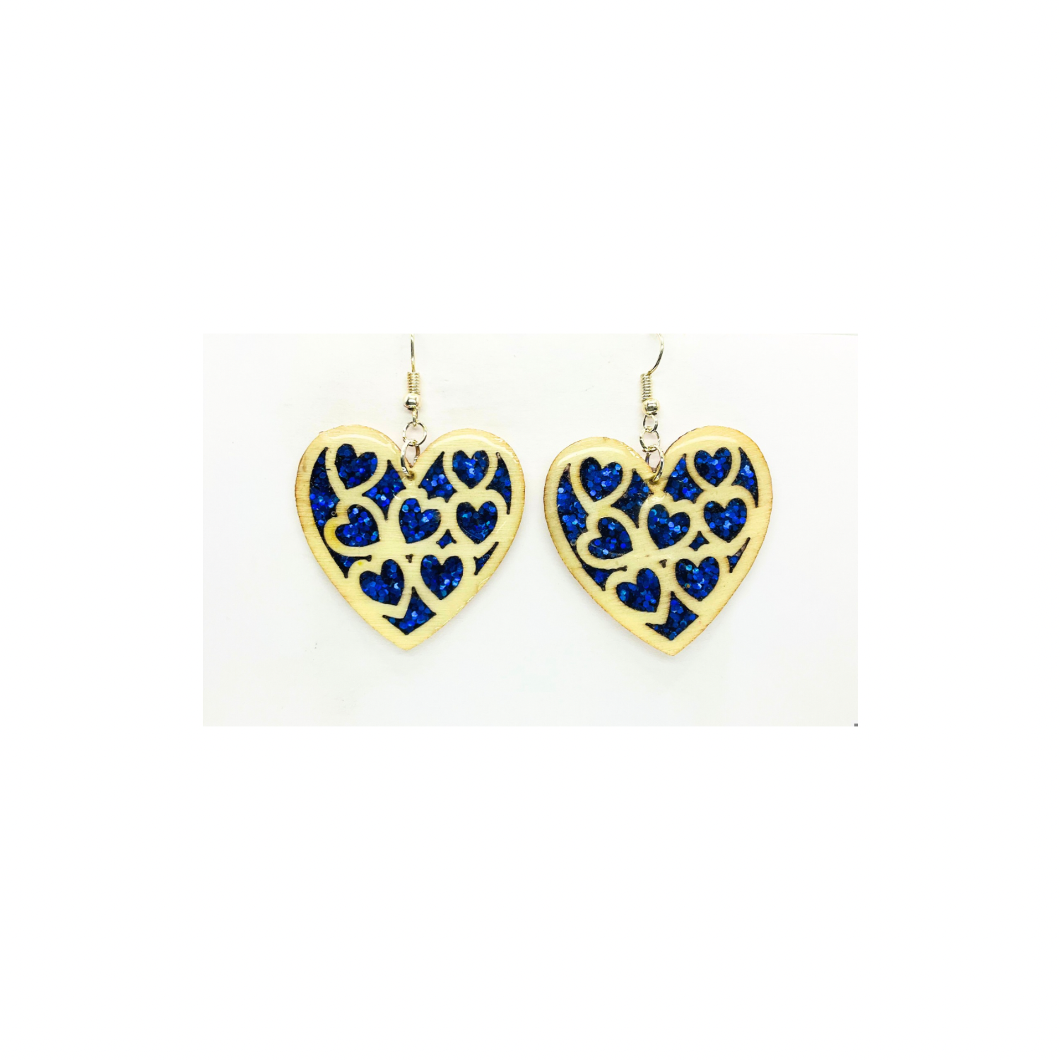 Blue Stained Glass Heart Earrings Handmade Wood Cutout with Sparkle Resin Silver Dangle Ear Hook Unique One-of-a-Kind Jewelry