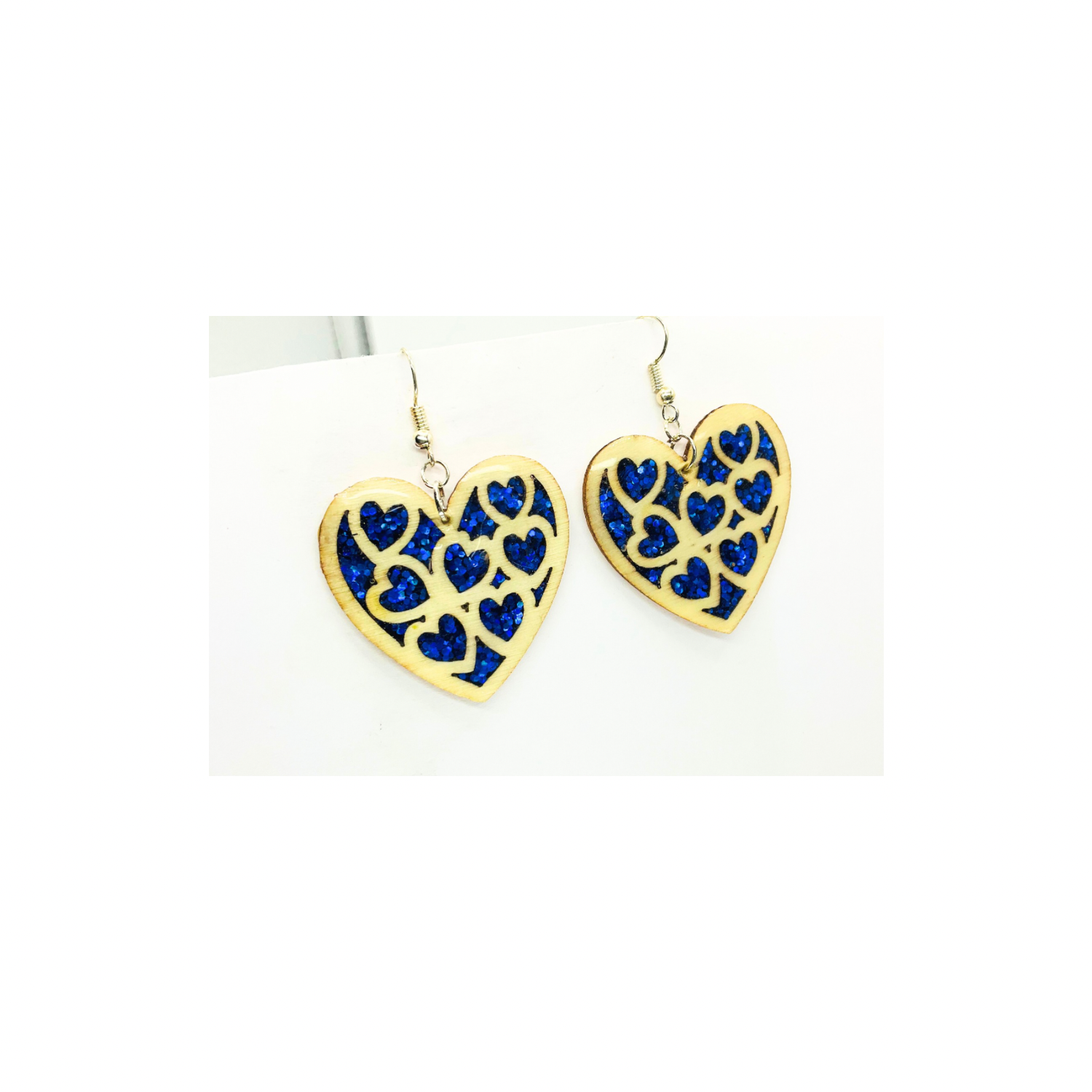 - Handmade Wood Cutout: These dangle heart earrings feature wood cutout hearts filled with sparkle resin, resembling stained glass. π
