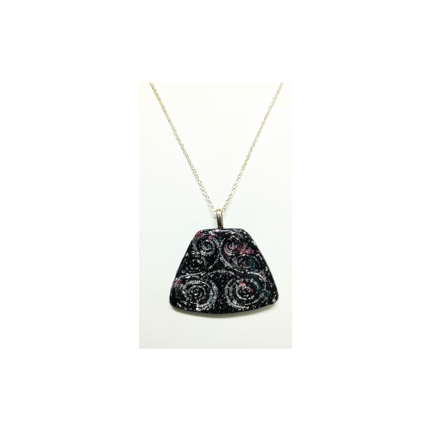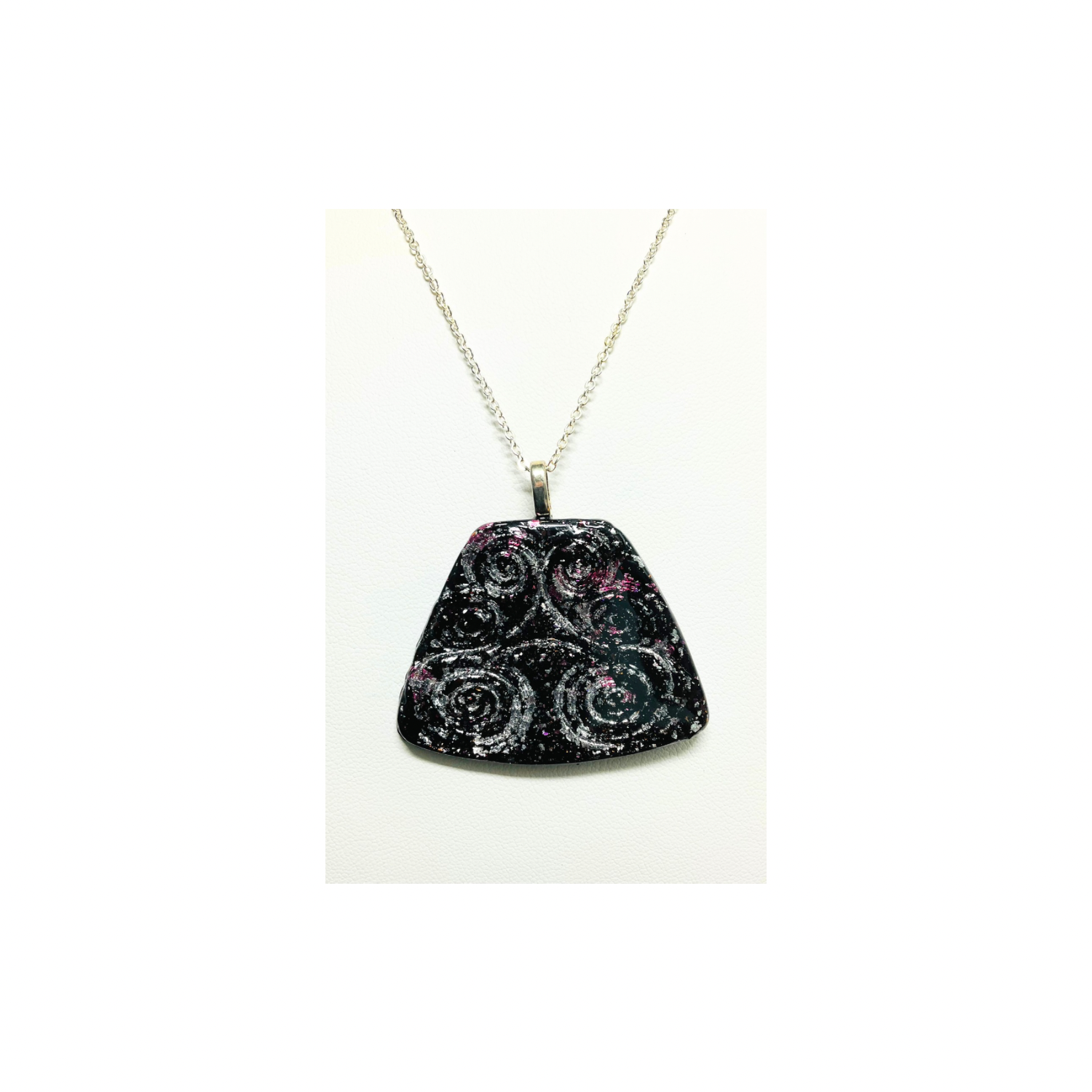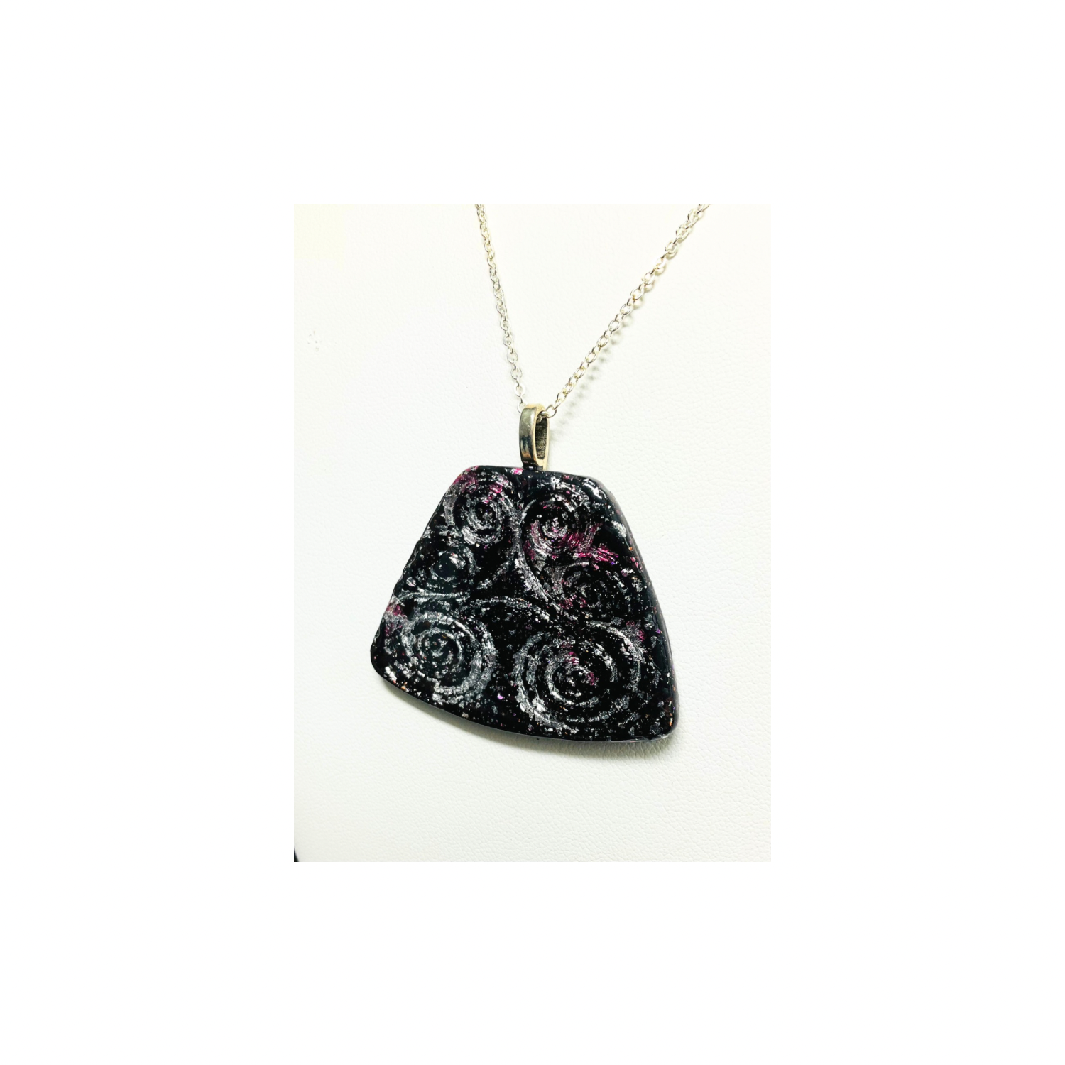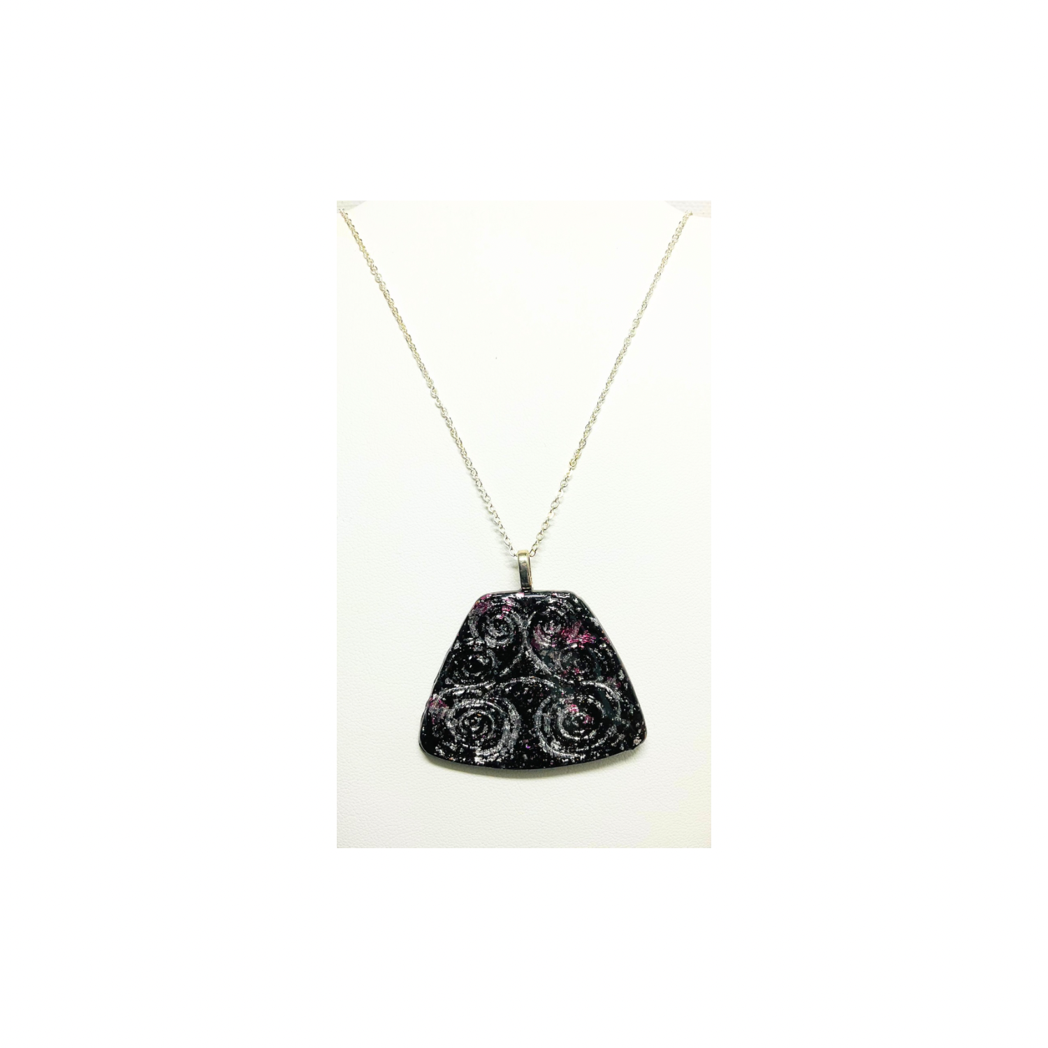 ✨ Elegant and Unique: This black pendant showcases swirls stamped into polymer clay, covered with silver foil. Its circular shape and smooth finish make it a standout piece. Perfect for any collection, it comes on an 18-inch silver chain for a stylish look. Handmade with love, each piece is unique and crafted with fun.