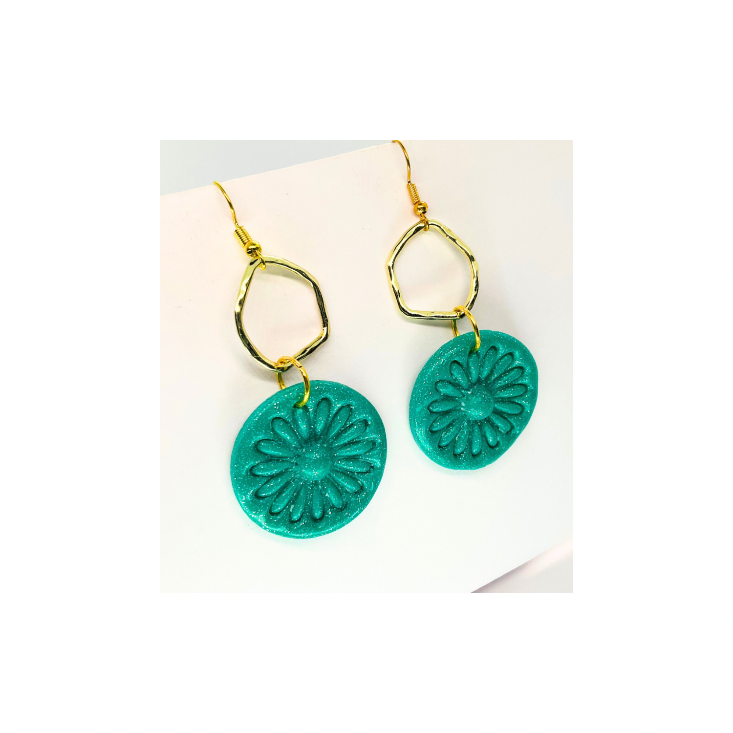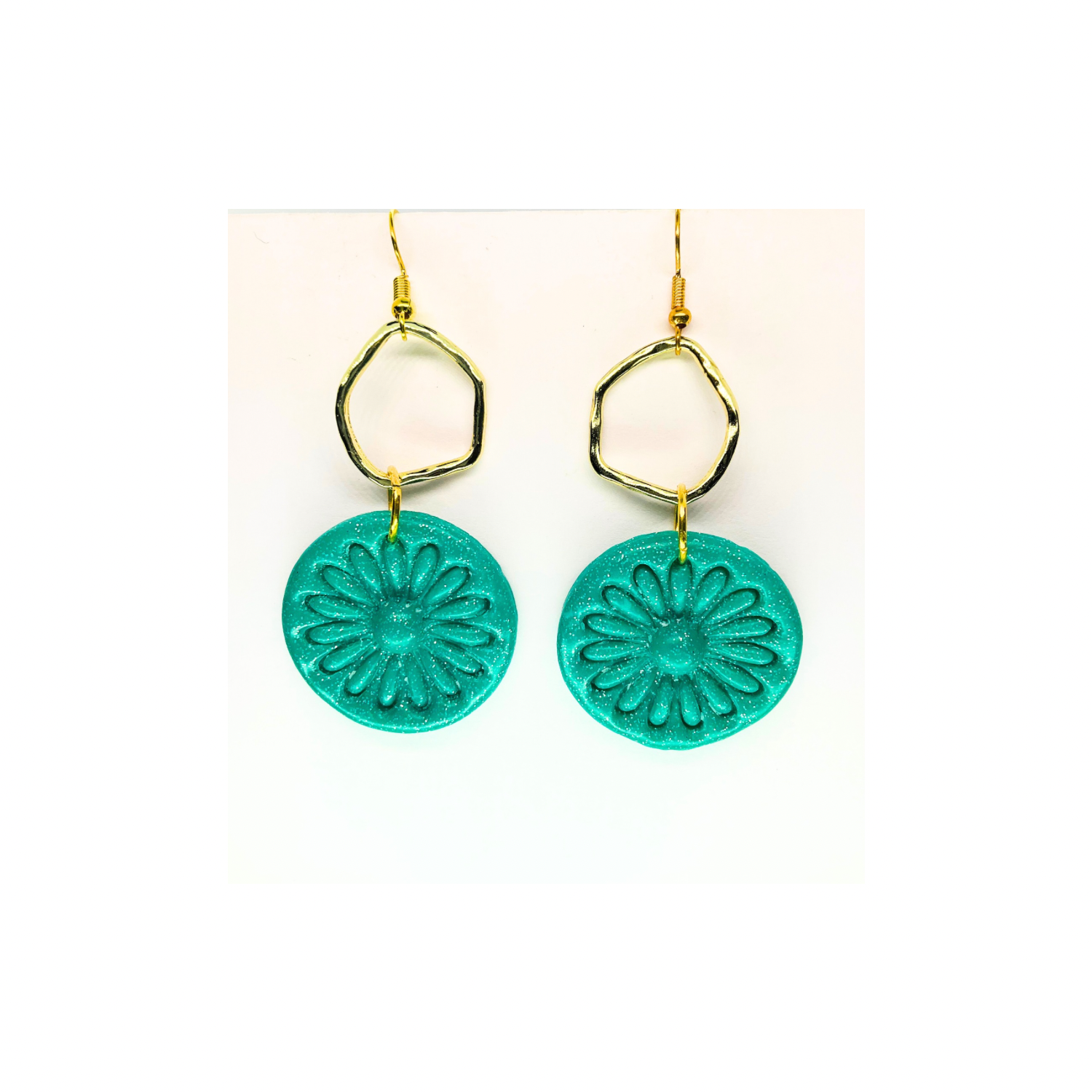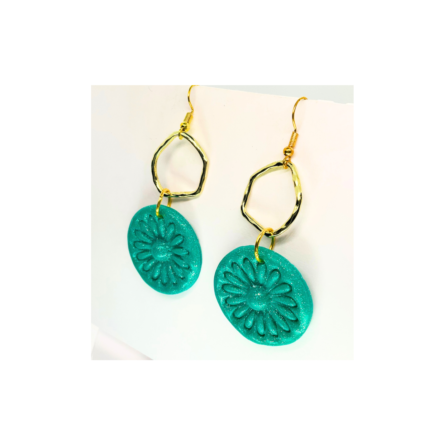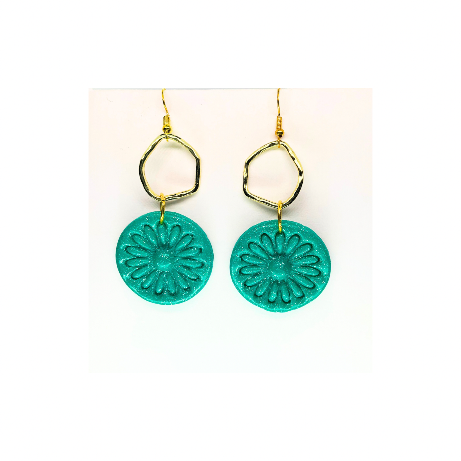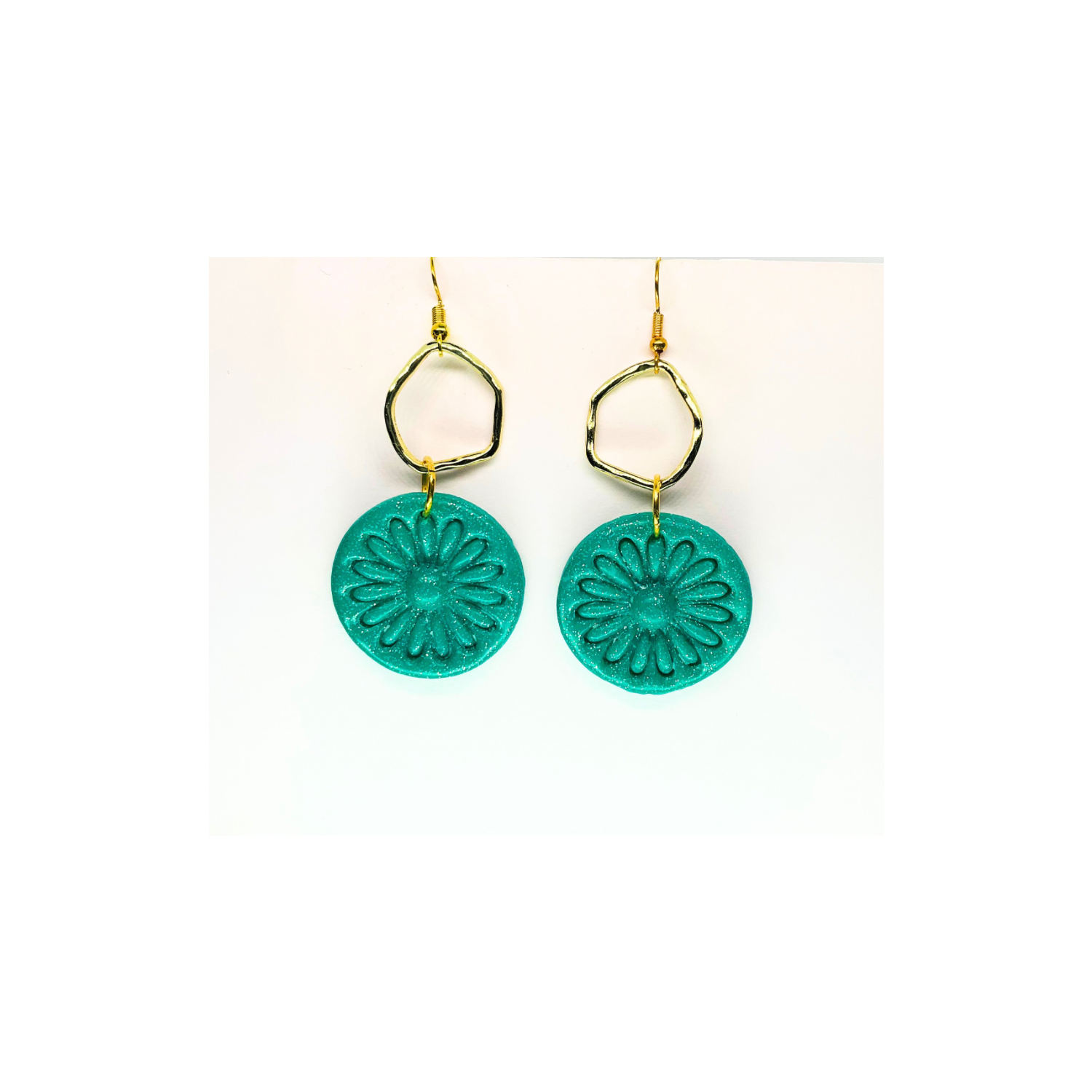 โจ Elegant Floral Design: These earrings feature a stunning teal green sparkle circle with a gold accent. The floral design adds a touch of sophistication to any outfit. Perfect for accessorizing your favorite ensemble.