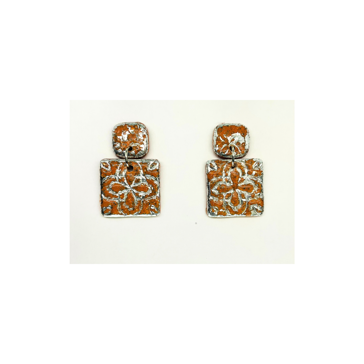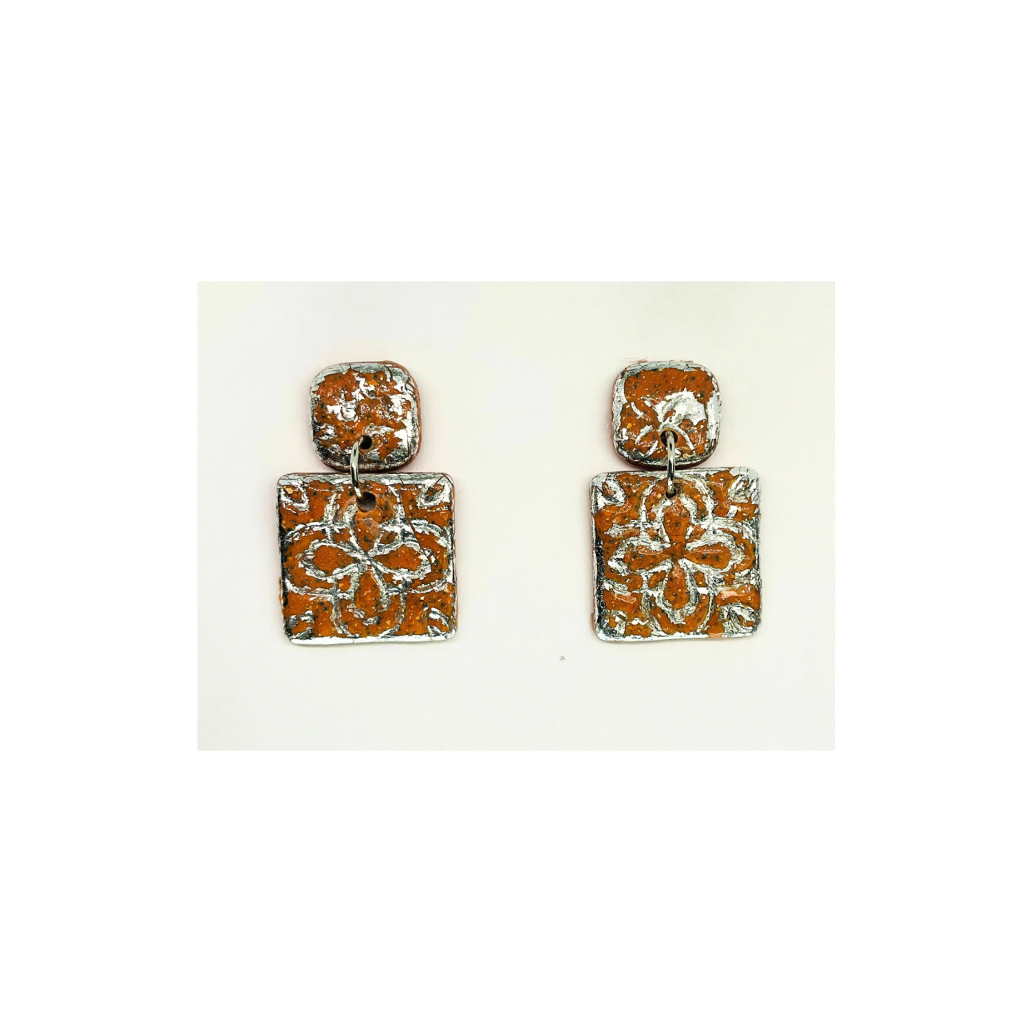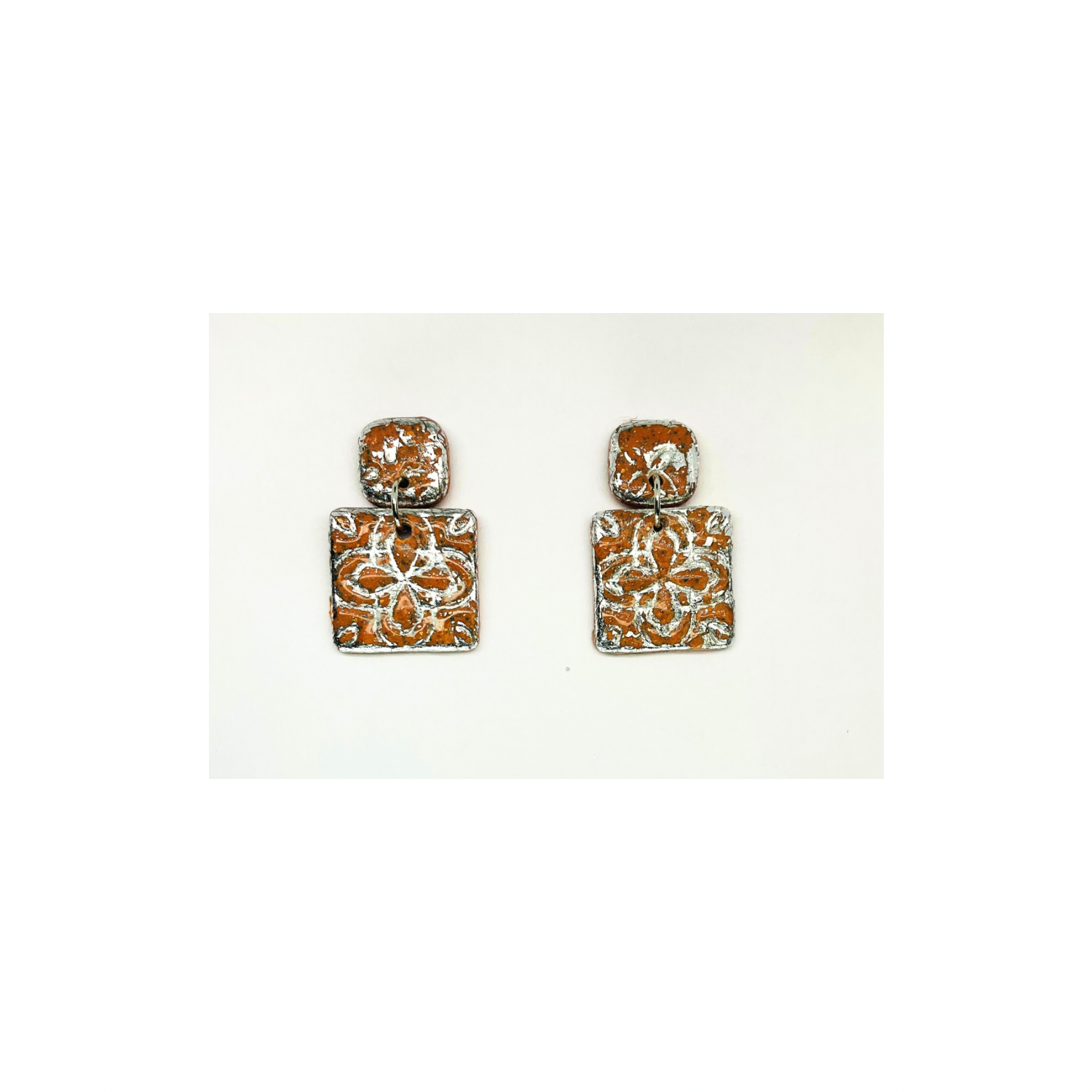 Terracotta Tile Stud Earrings for Women - Square Design with Orange and Silver Patterns Elegant Everyday Wear Jewelry