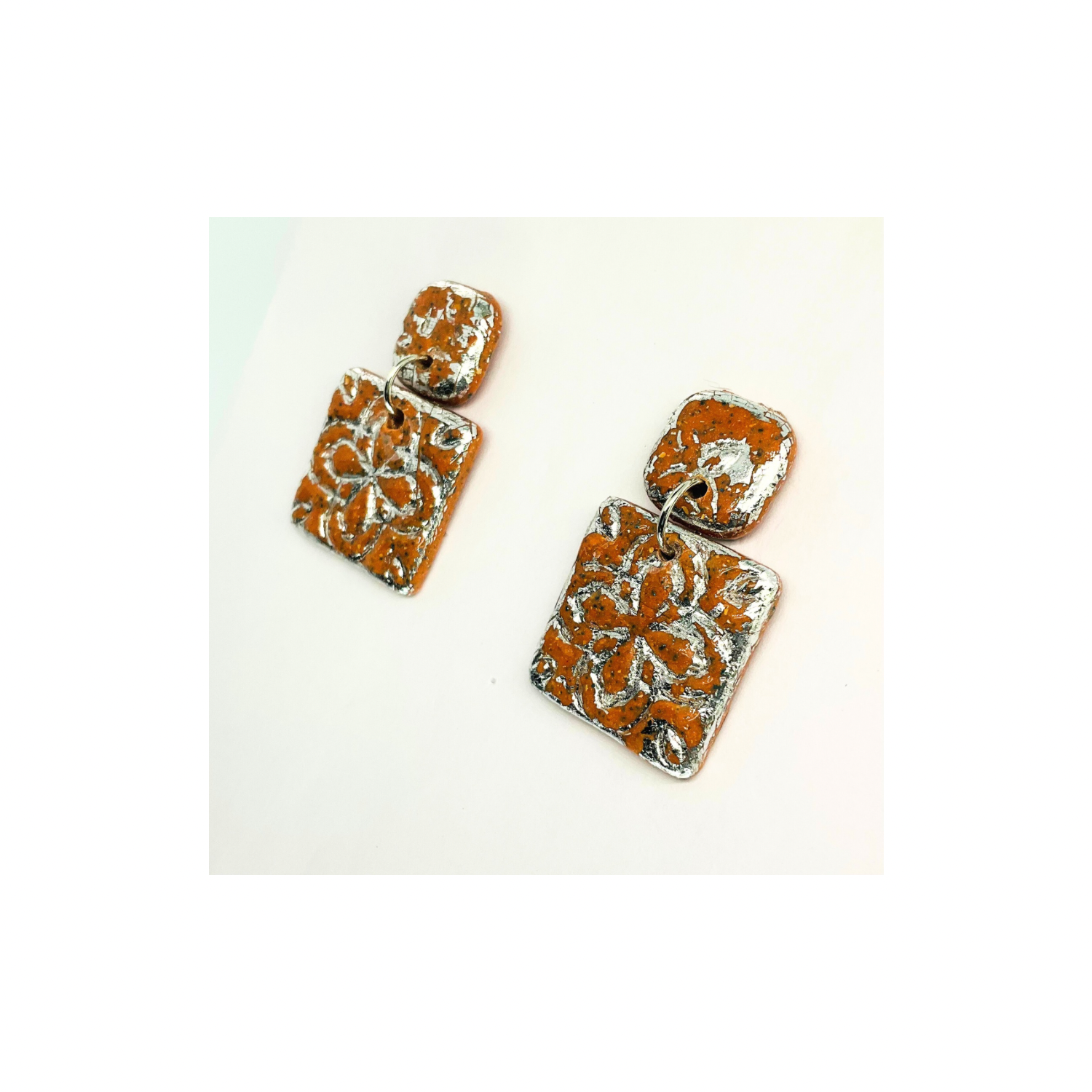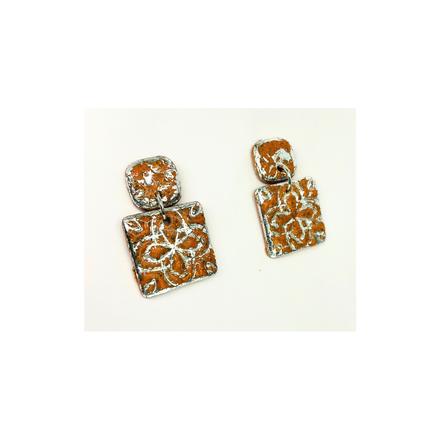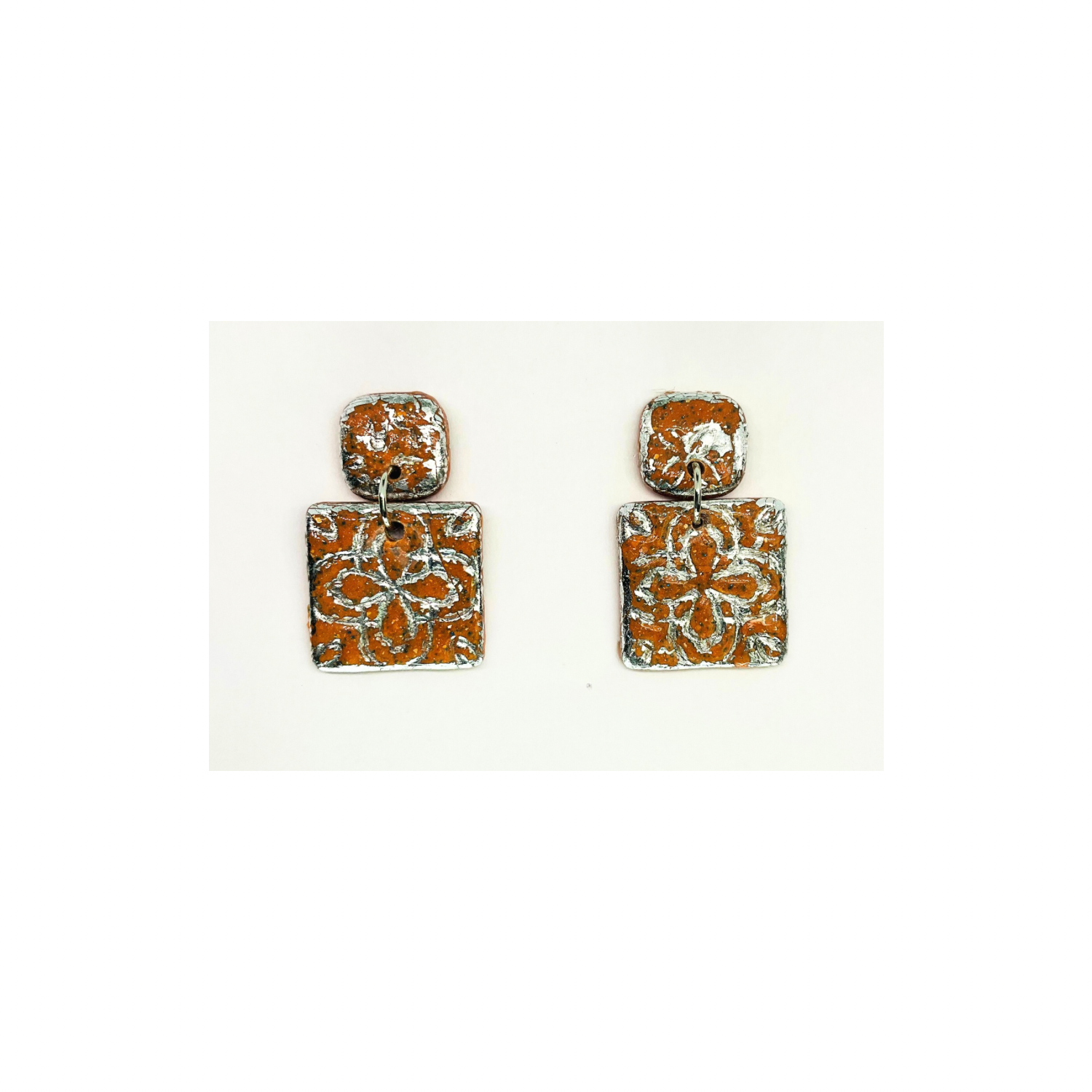 Terracotta Tile Stud Earrings for Women - Square Design with Orange and Silver Patterns Elegant Everyday Wear Jewelry