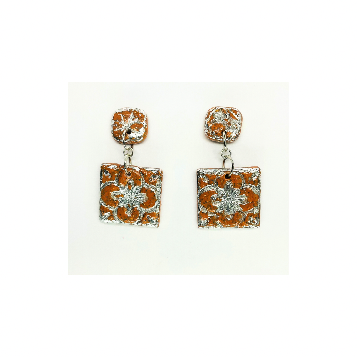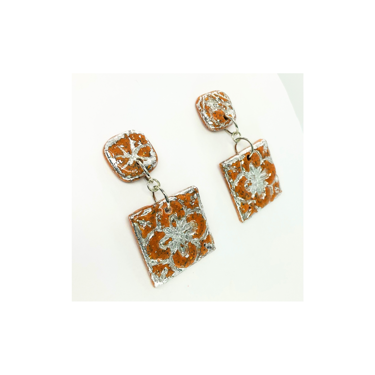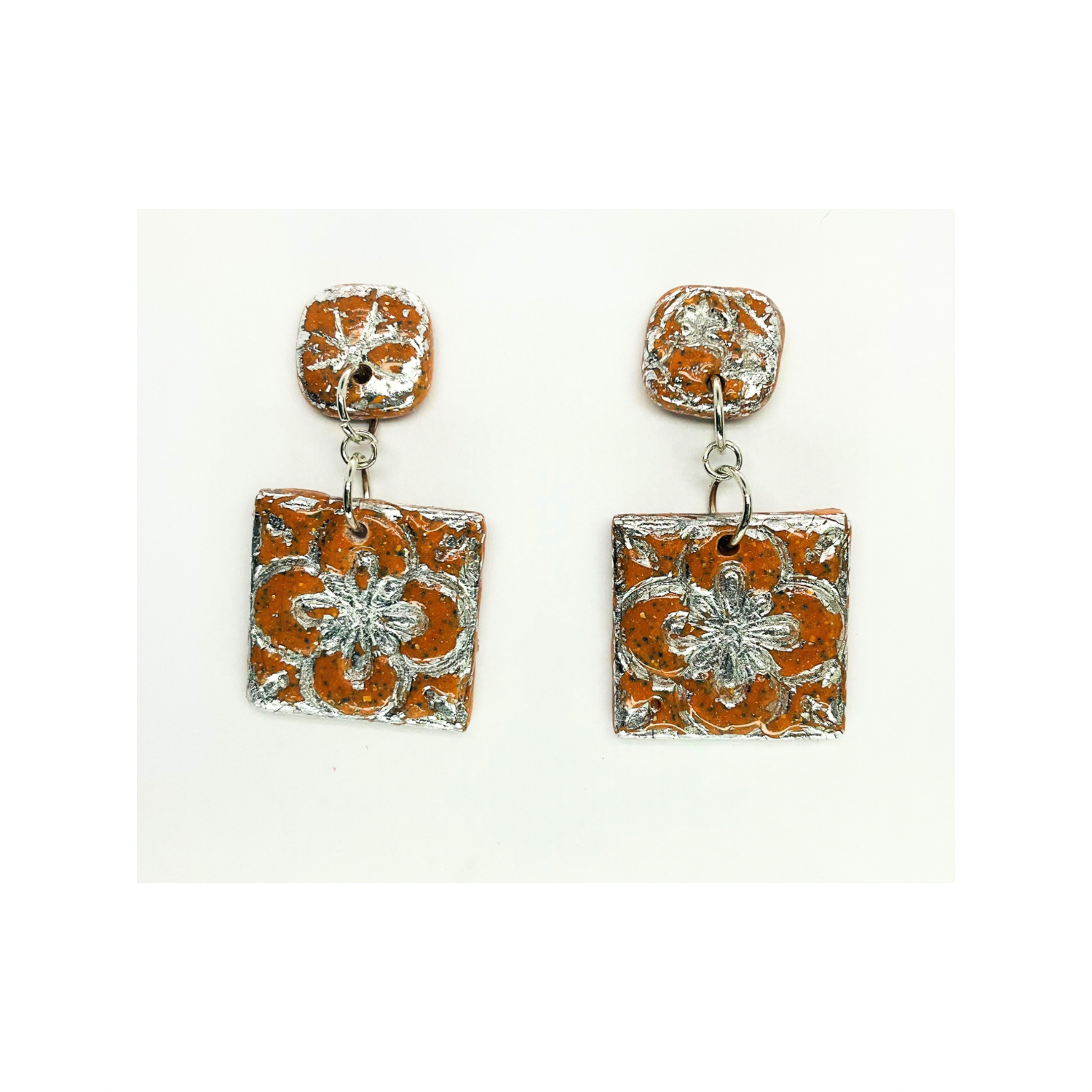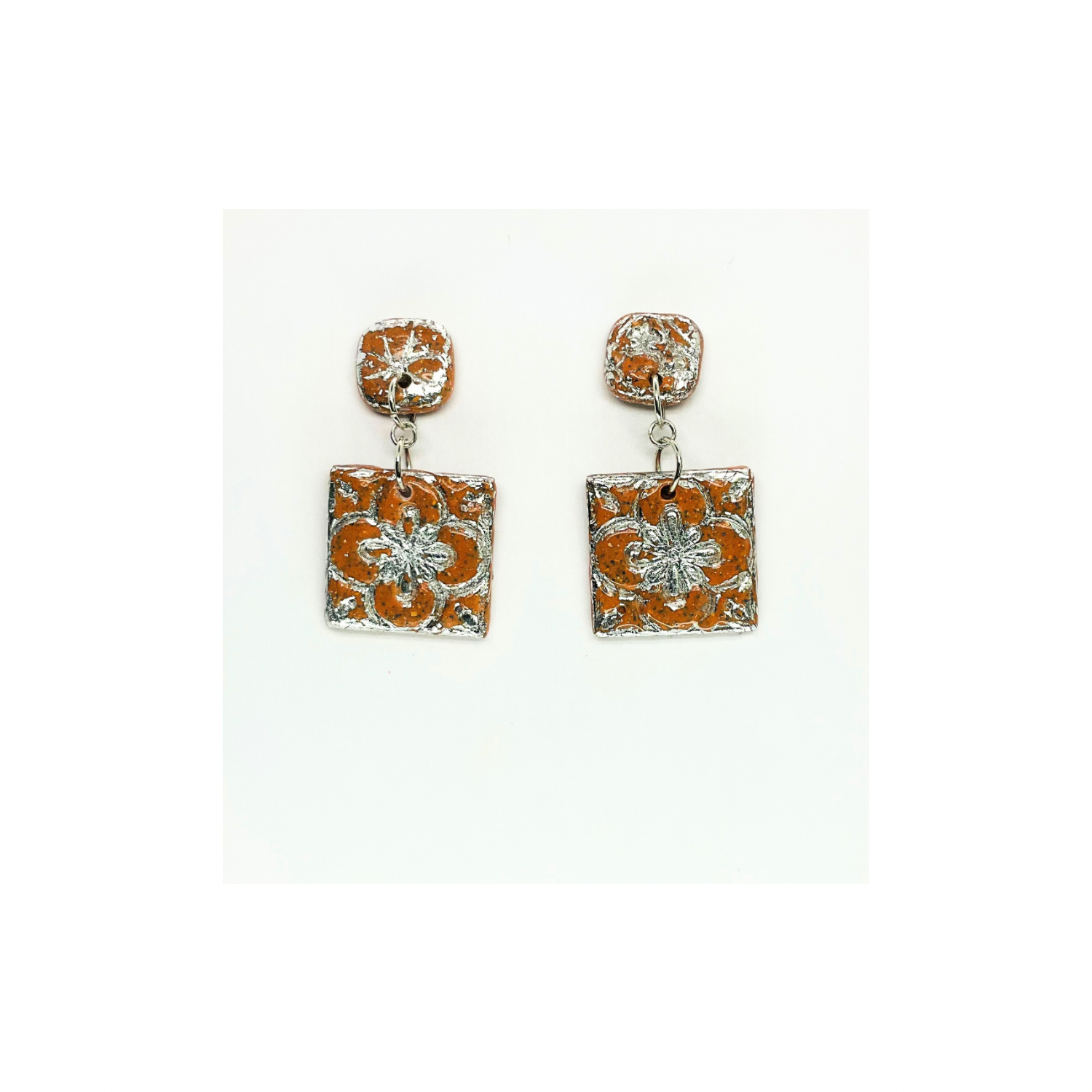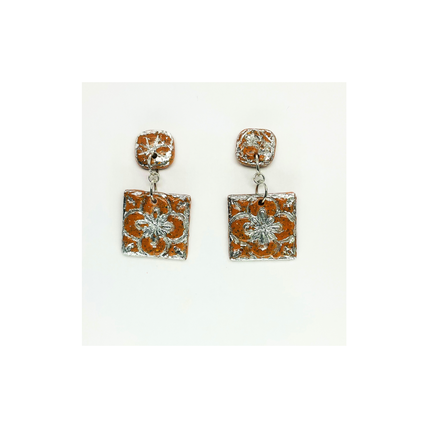Terracotta Tile Stud Square with Silver Accents Dangle Earrings - Teracotta and Silver Design