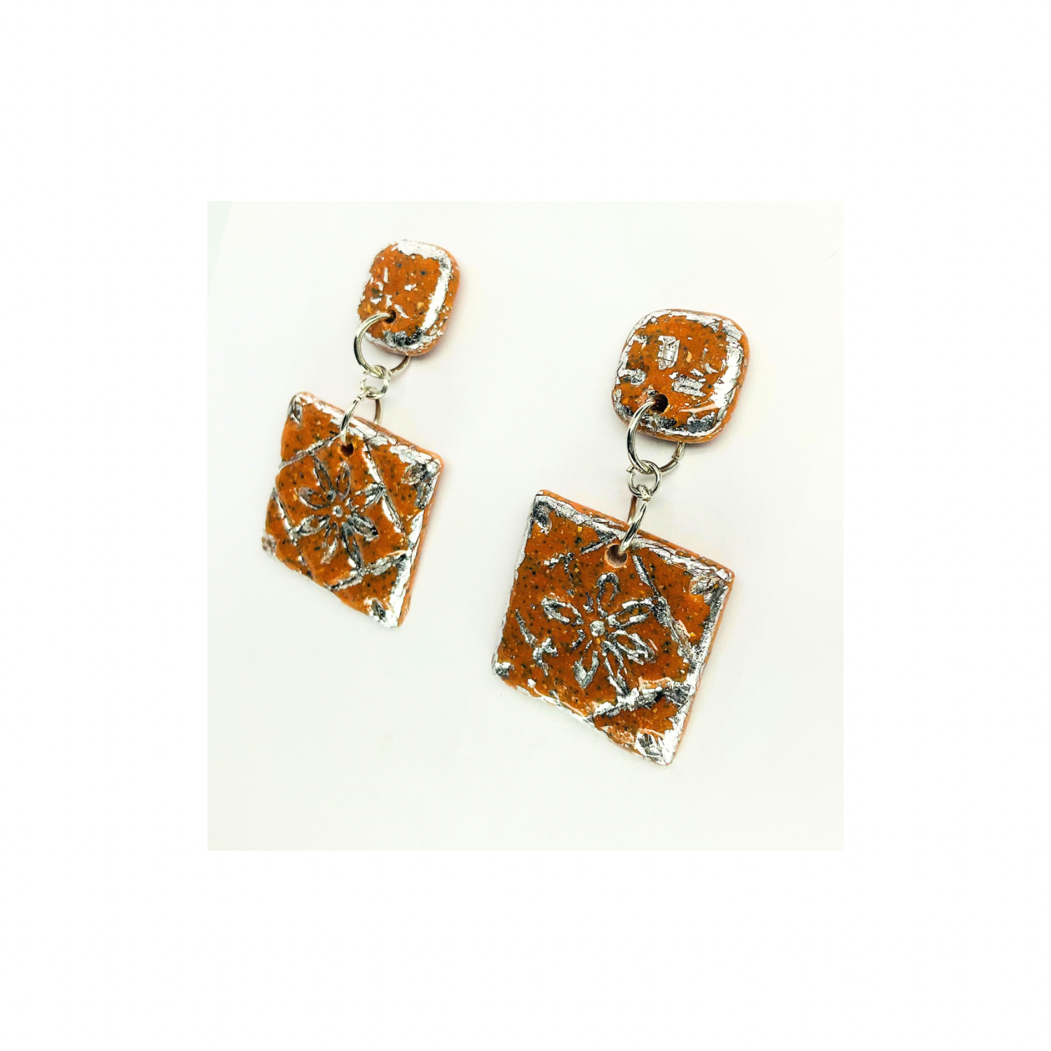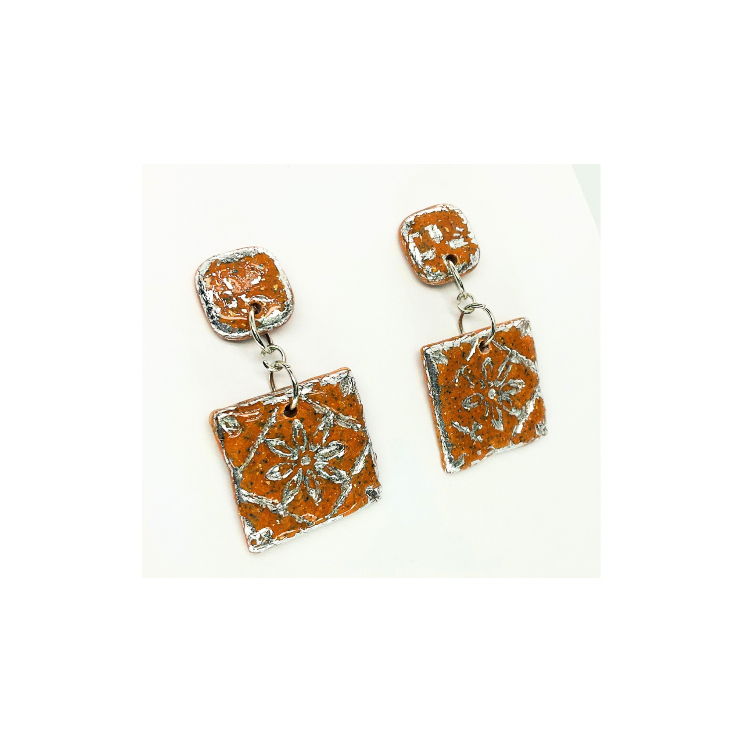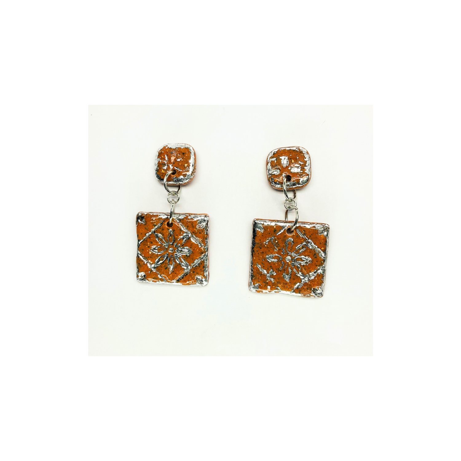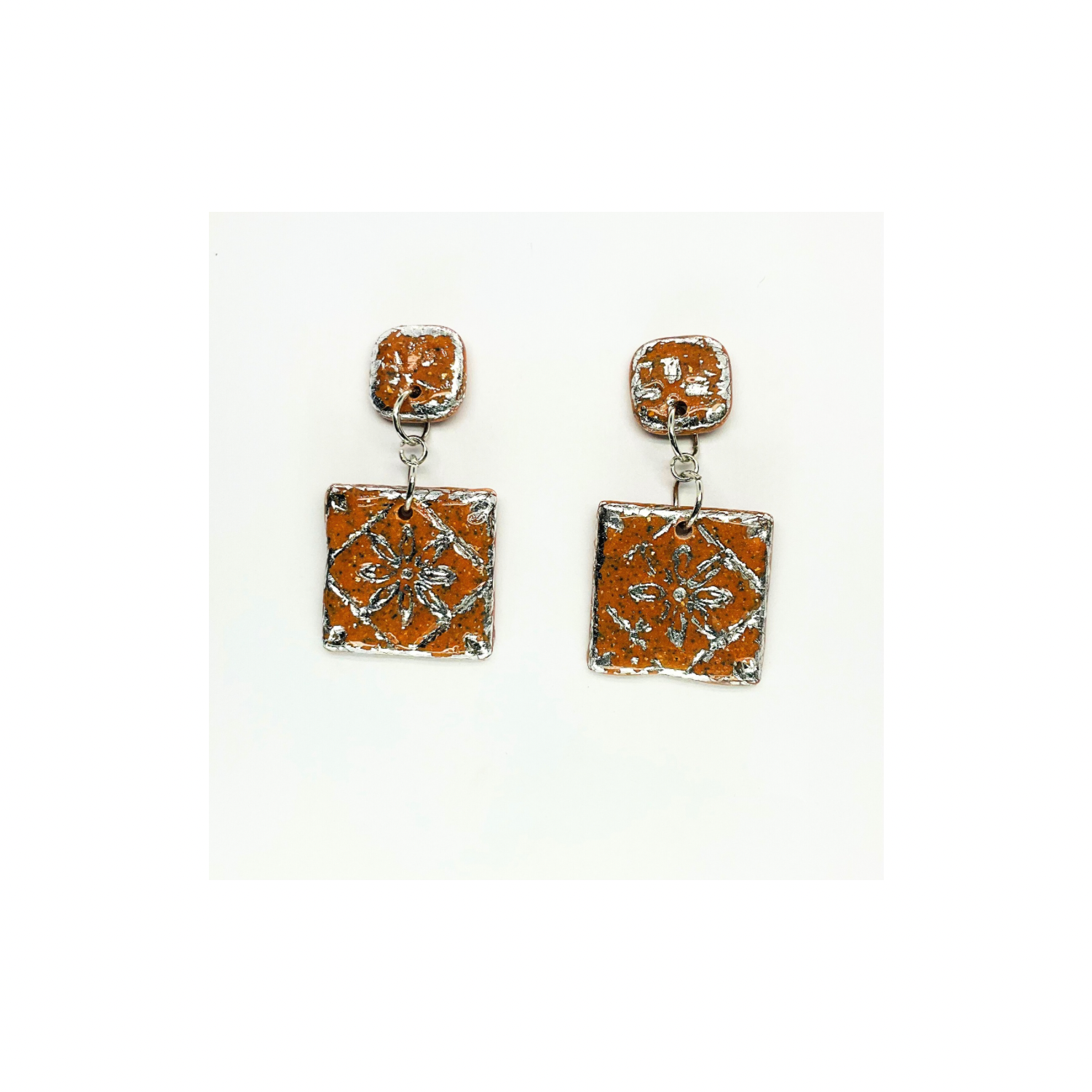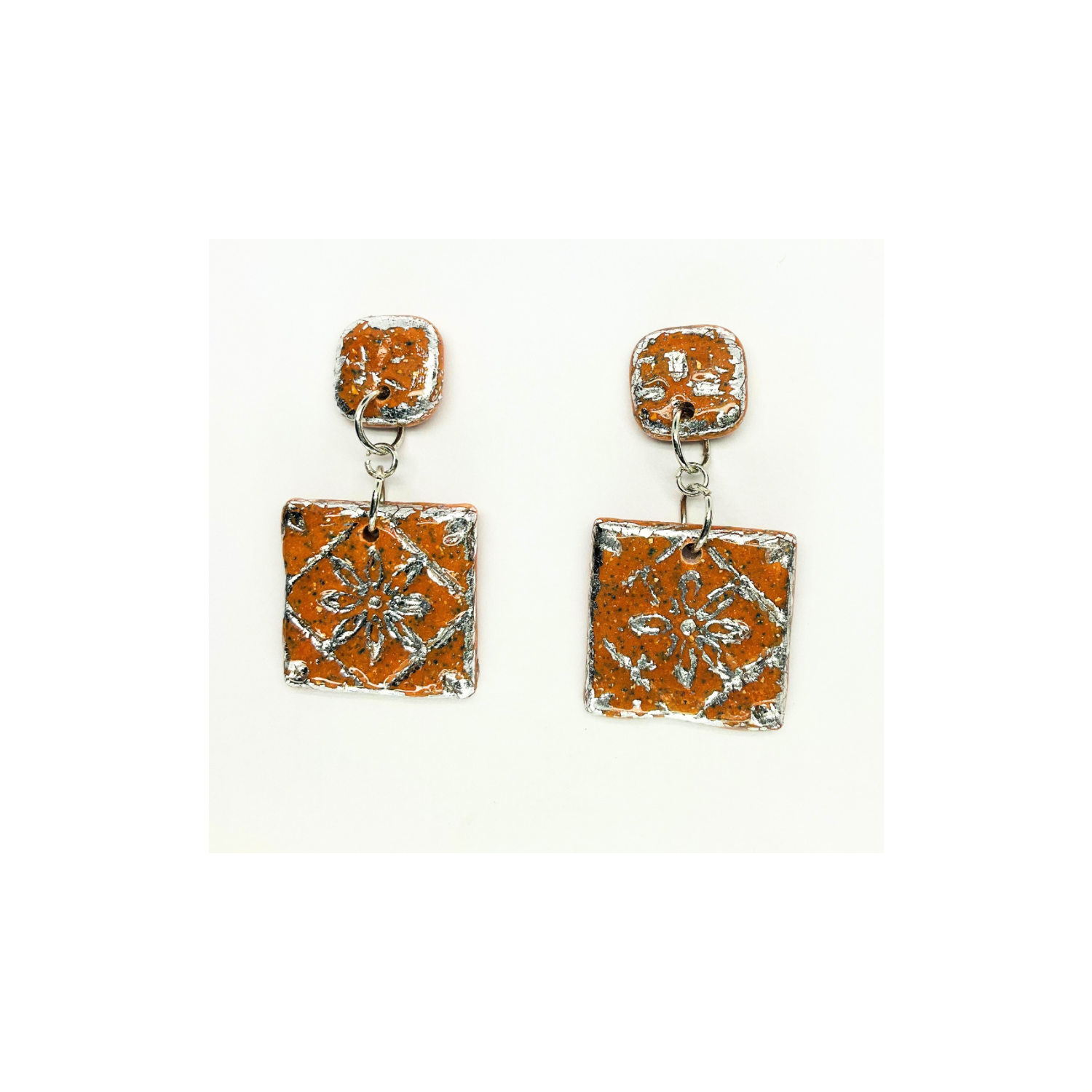 - Terracotta Tile Stud with Silver Accents: These earrings feature a unique square design, perfect for adding a touch of elegance to any outfit. The terracotta tiles are complemented by silver accents, creating an intricate pattern that catches the light beautifully.
