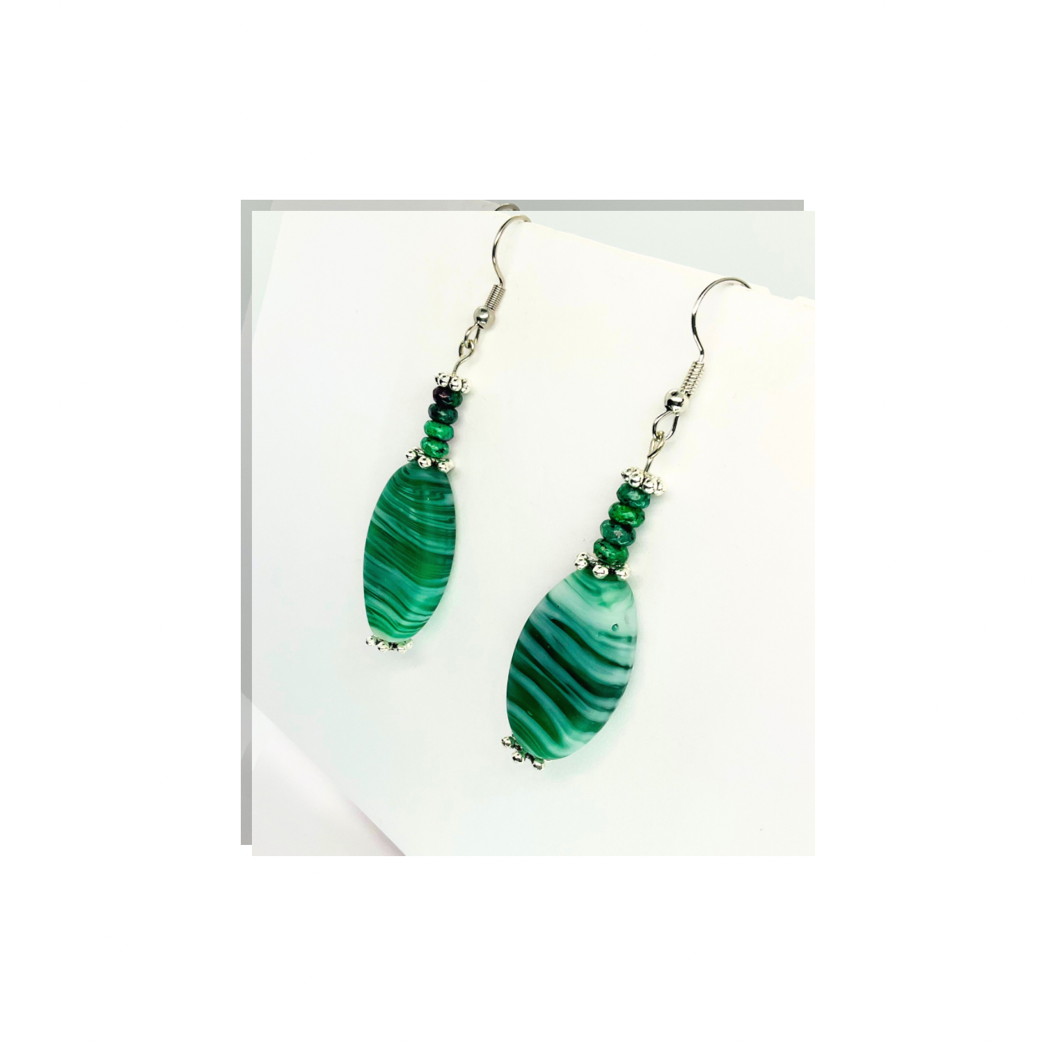 - These earrings feature a translucent green glass bead, creating a delicate and sophisticated look. Perfect for adding a touch of elegance to any outfit. The beads dangle gracefully, enhancing their appeal. Ideal for those who appreciate subtle yet stylish accessories.