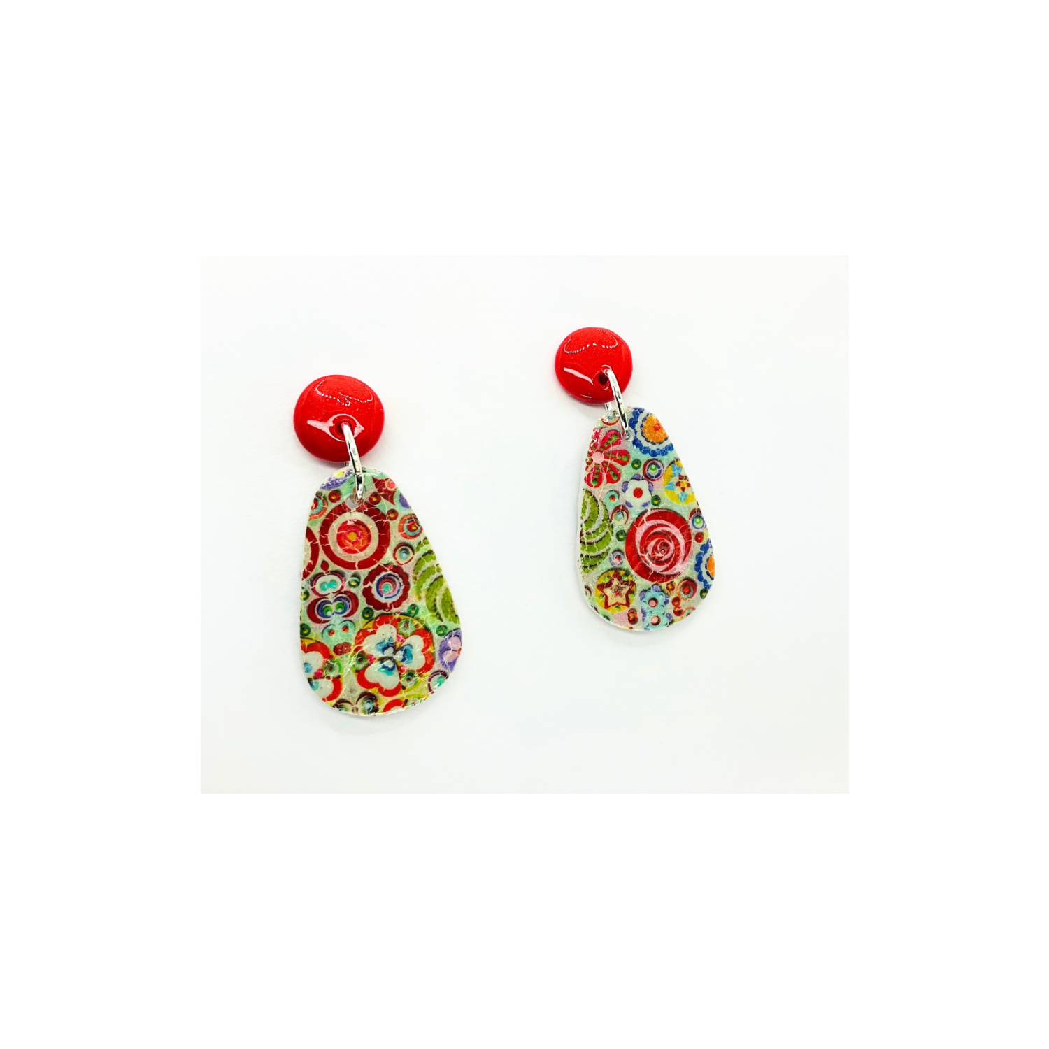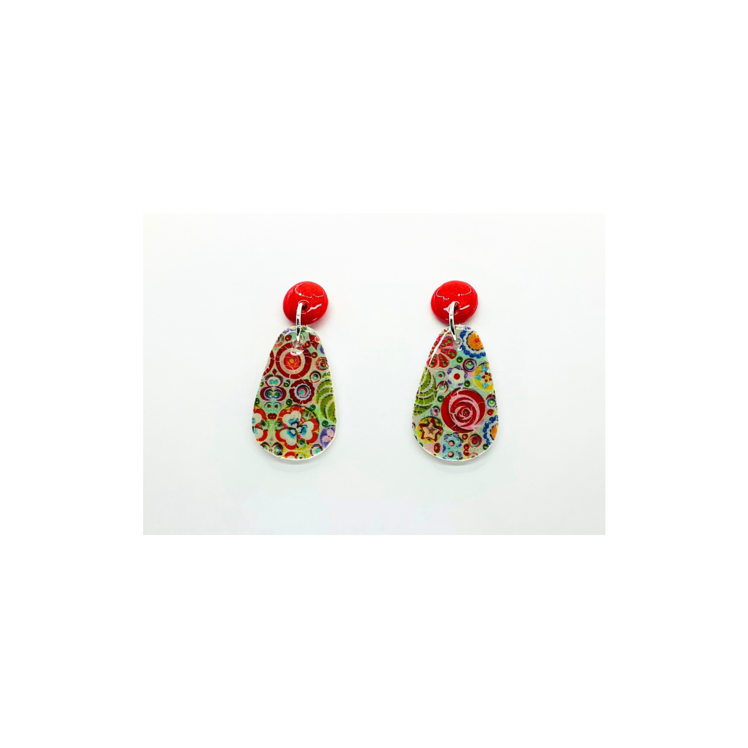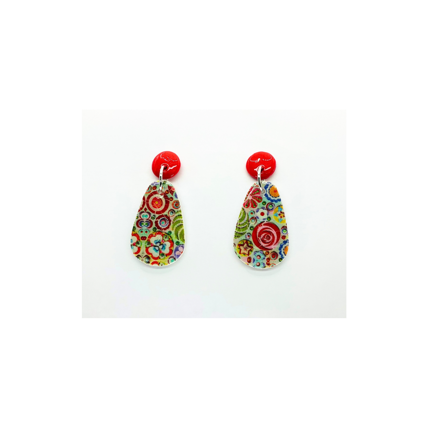 Whimsical Red and Green Dangle Earrings with Red Button Stud