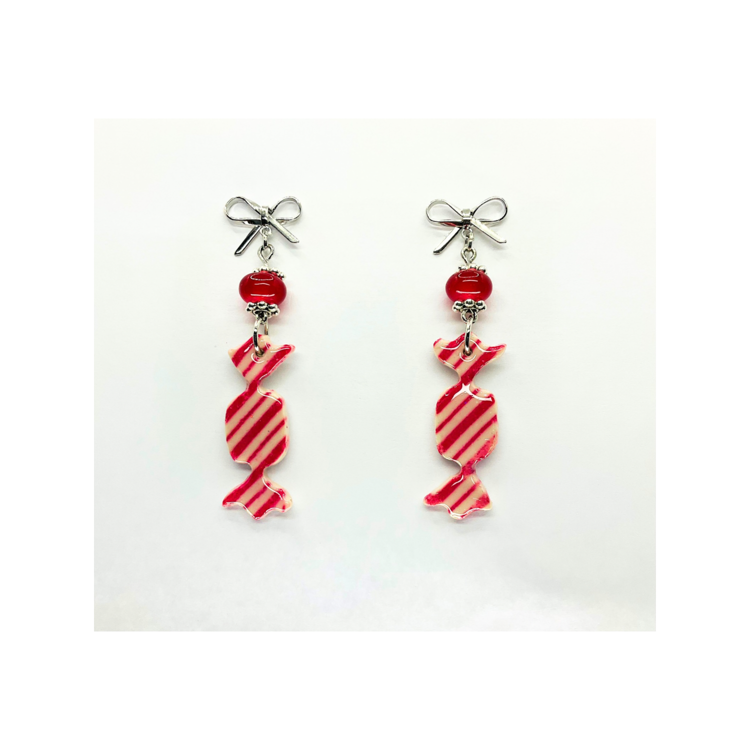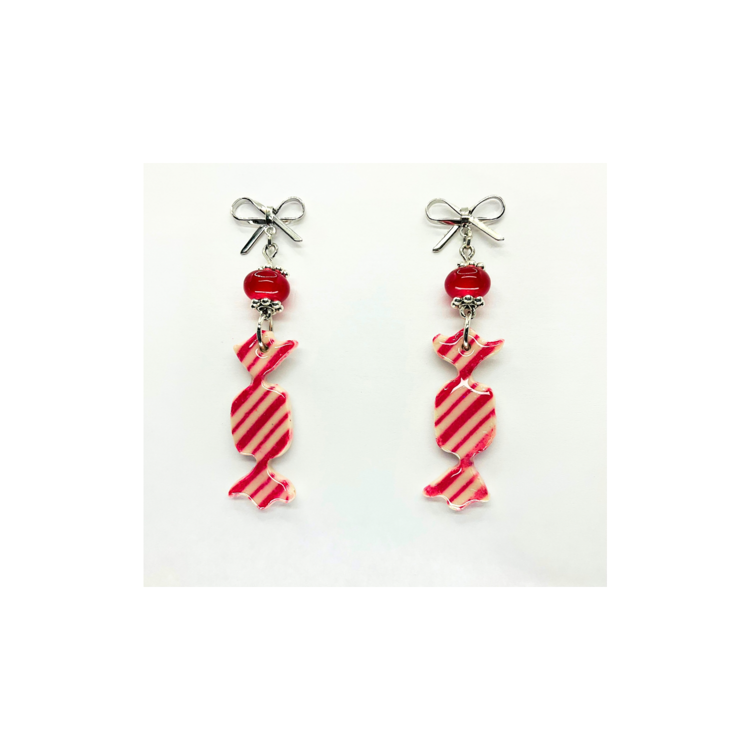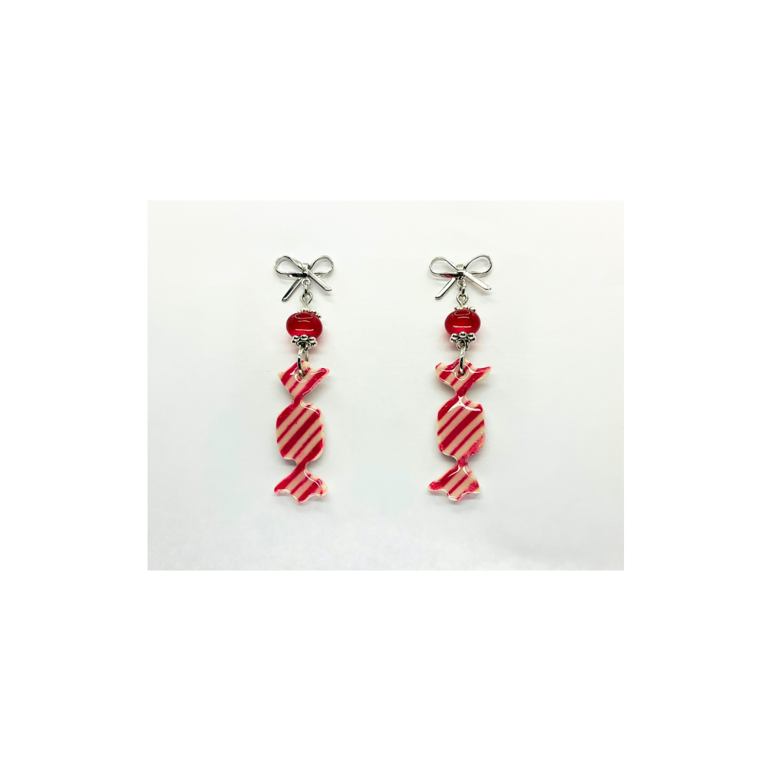 Whimsical Wrapped Candy Red & White Striped Dangle Earrings with Bead & Silver Bow – Unique Jewelry for Daily or Gift Giving Moments