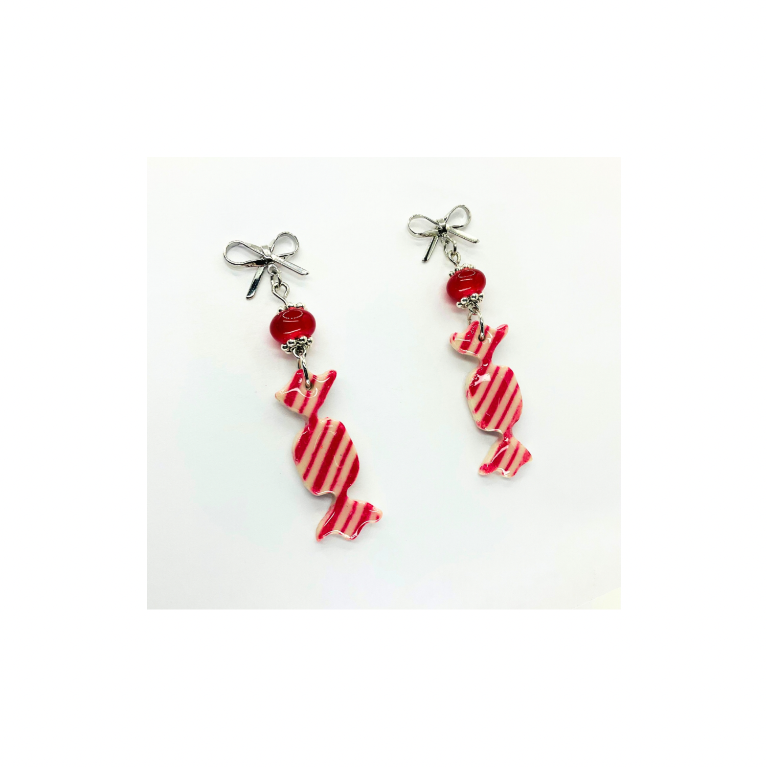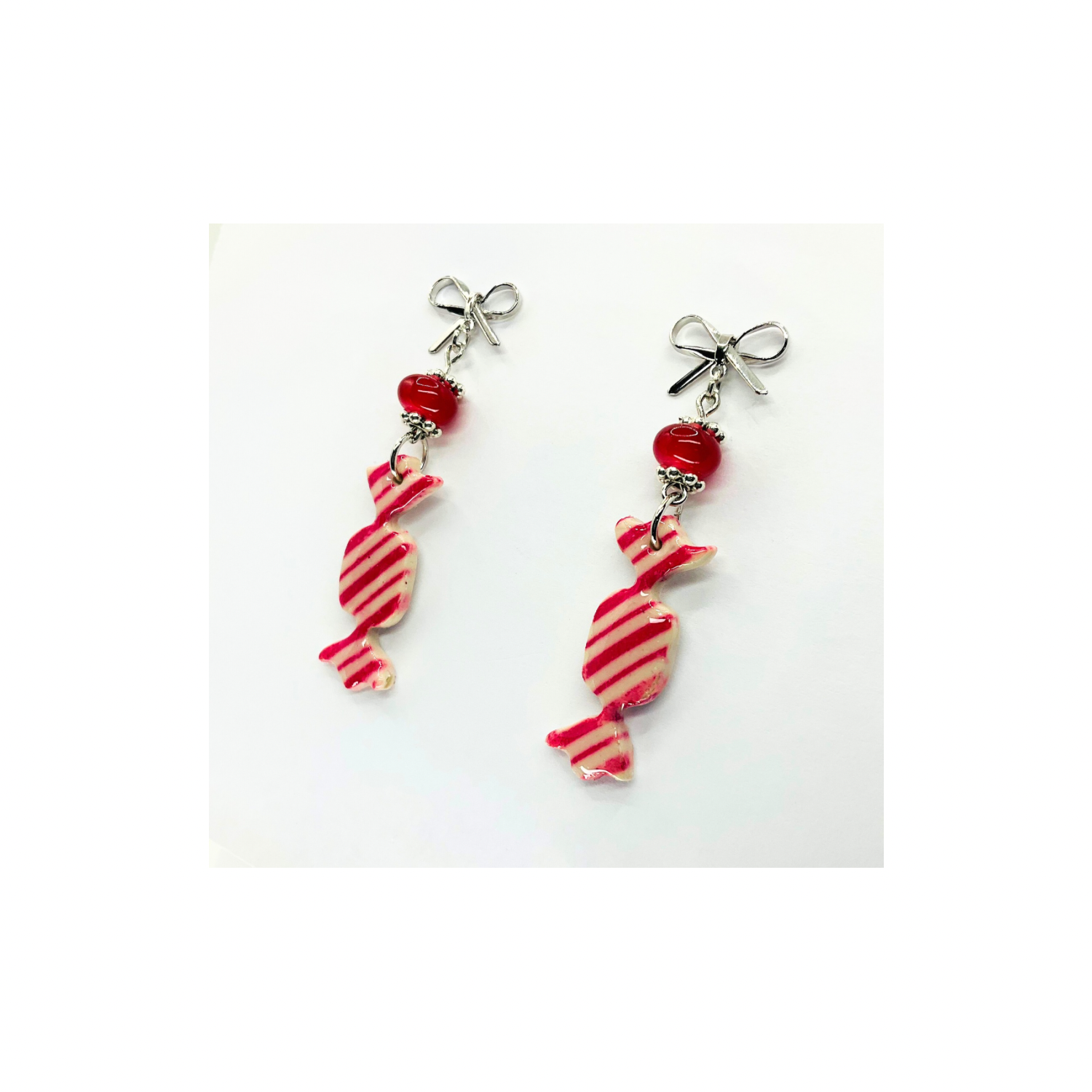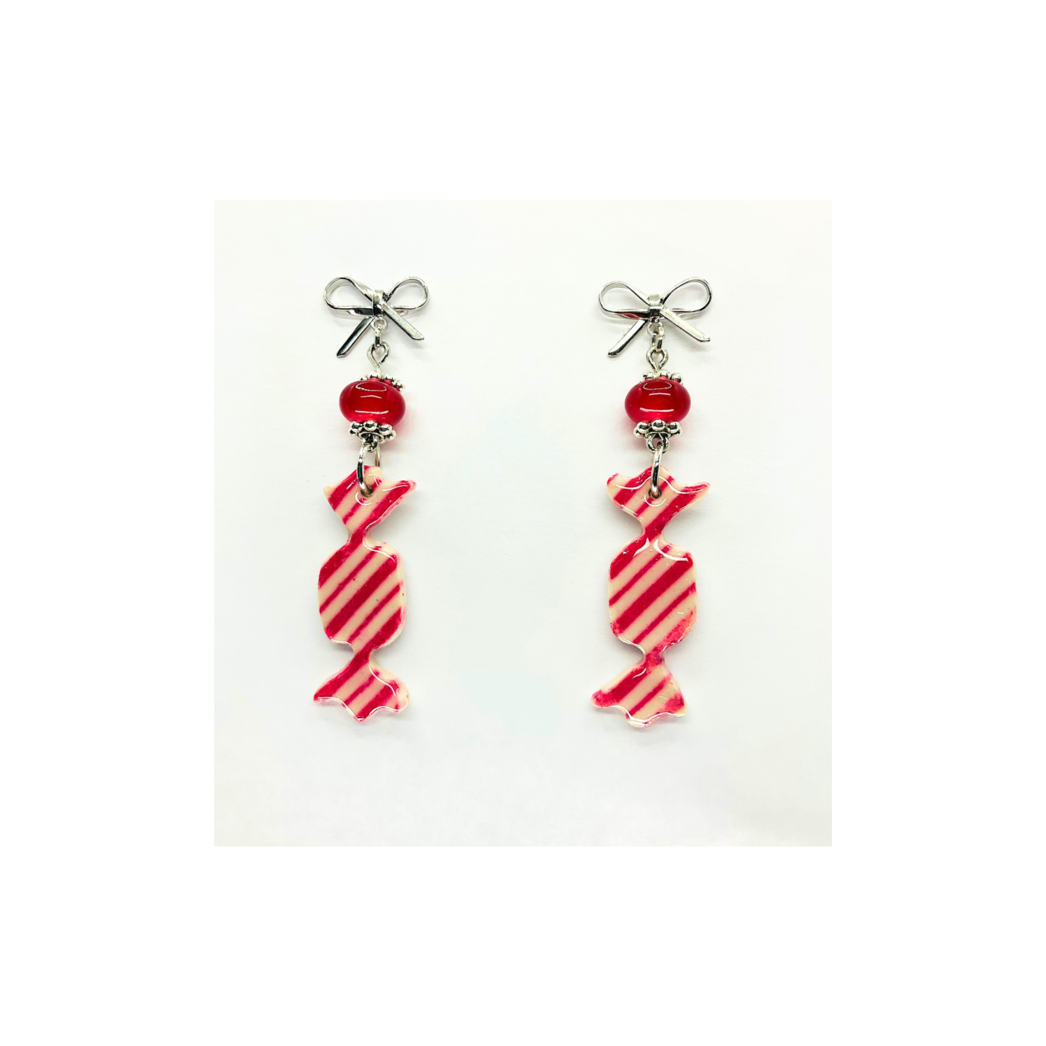 Whimsical Wrapped Candy Red & White Striped Dangle Earrings with Bead & Silver Bow – Unique Jewelry for Daily or Gift Giving Moments